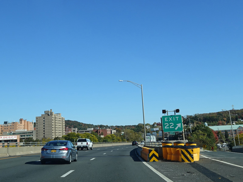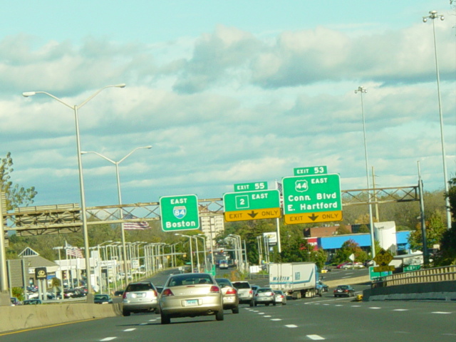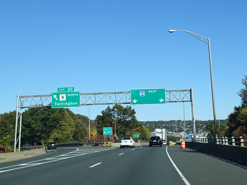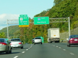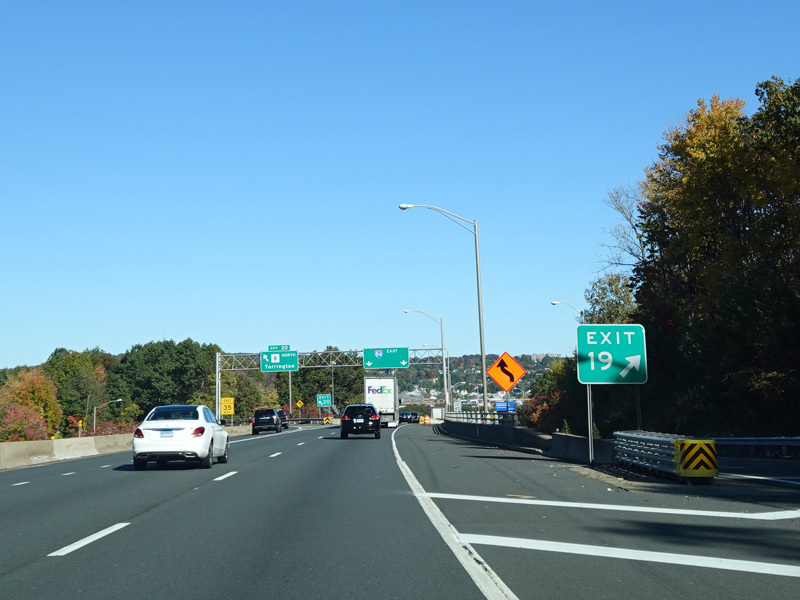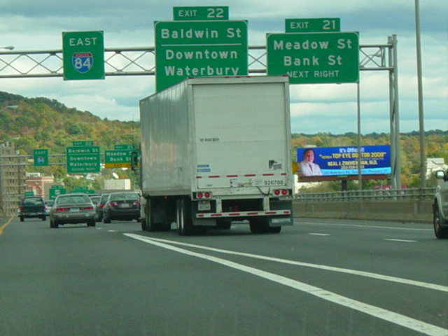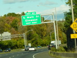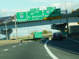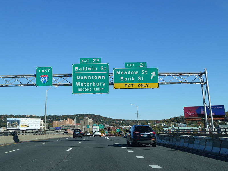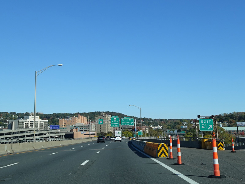 These pictures show the Yankee Expressway in the same area in Waterbury as it appeared after the construction work was completed. In the years since, another construction project has combined exits 21-22 into a single exit 22 that is signed only for Downtown Waterbury.