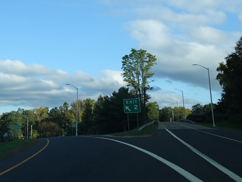 The ramp for exit 2 splits when travelling east. Bear left for Mill Plain Road (US 6/US 202) and Old Ridgebury Road. Bear right for the rest area and the Connecticut welcome center.