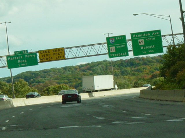 From the ramp for exit 23 of I-84 east, there are exits for Hamilton Avenue (CT 69) north and south.