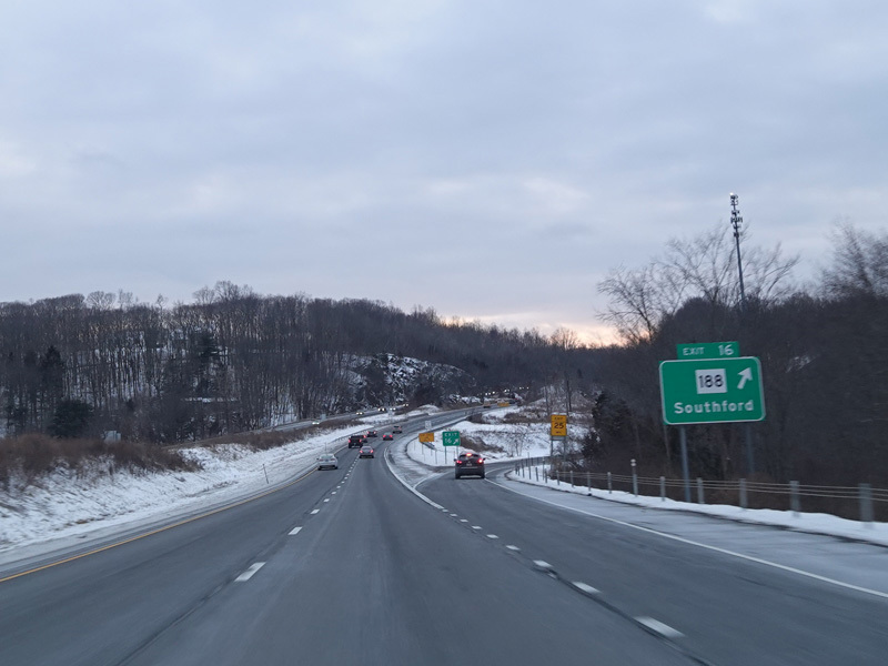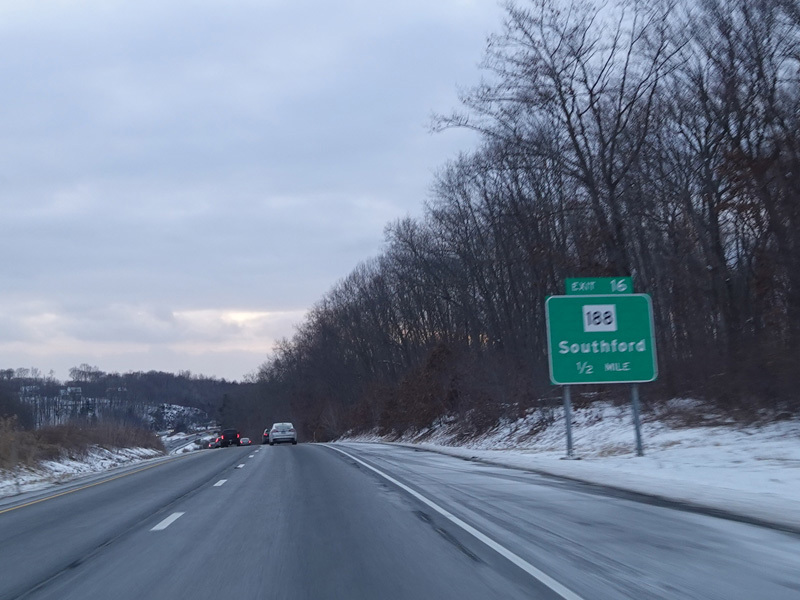Exit 16 is for Strongtown Road (CT 188).