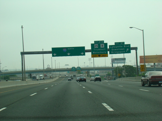 The Connecticut Turnpike is the main highway in southern Connecticut. It is part of I-95, which runs from Florida to Maine. The New England Thruway becomes the Connecticut Turnpike at the New York-Connecticut state line. It runs northeast to New Haven, and then east along the shore. At exit 76 in East Lyme, the Connecticut Turnpike leaves I-95 and runs north as I-395. I-95 continues east to the Rhode Island border. It is a six-lane highway from the New York border to exit 54 in Branford. It is then a four-lane highway for the remainder of its length, except for section between exits 83 and 88 in New London and Groton, where it is six lanes wide again for a short distance. Although the section of I-95 in Connecticut runs primarily east and west, it is signed as a north/south road for consistency with the rest of I-95.