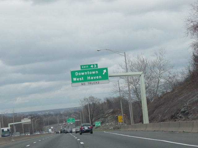 These old button-copy signs used to mark exit 43 of the Connecticut Turnpike. They have been replaced with new signs saying that the exit is for Campbell Avenue instead of Downtown West Haven.