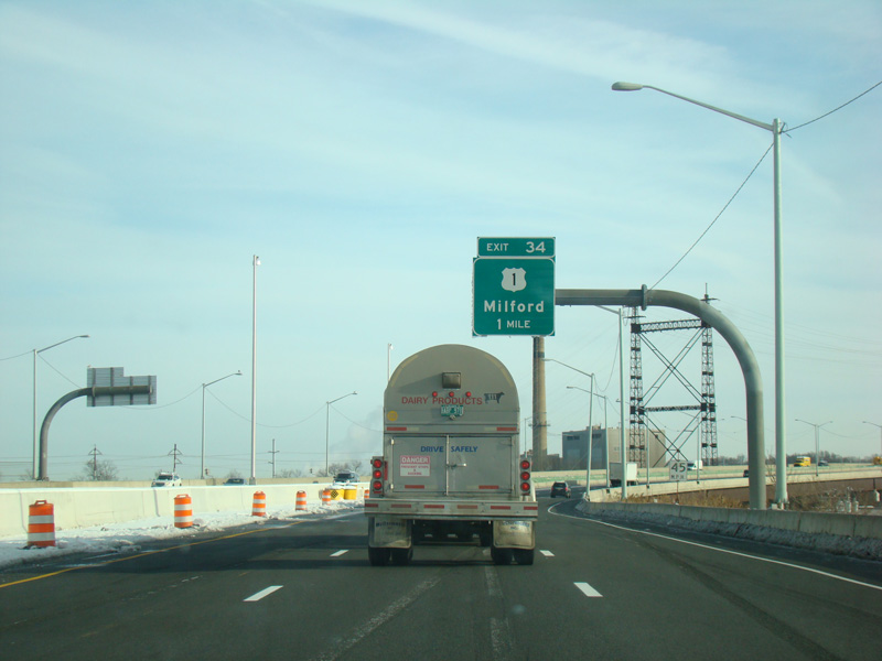 The Connecticut Turnpike crosses the Housatonic River to New Haven County. Exit 34 is for Bridgeport Avenue (US 1).