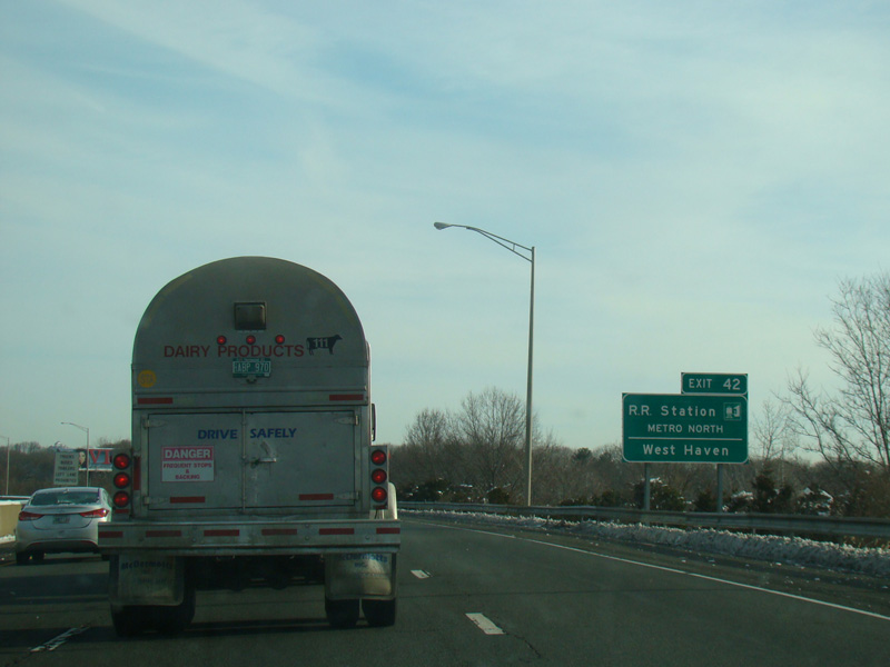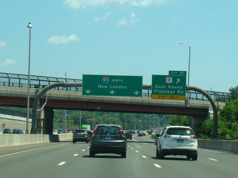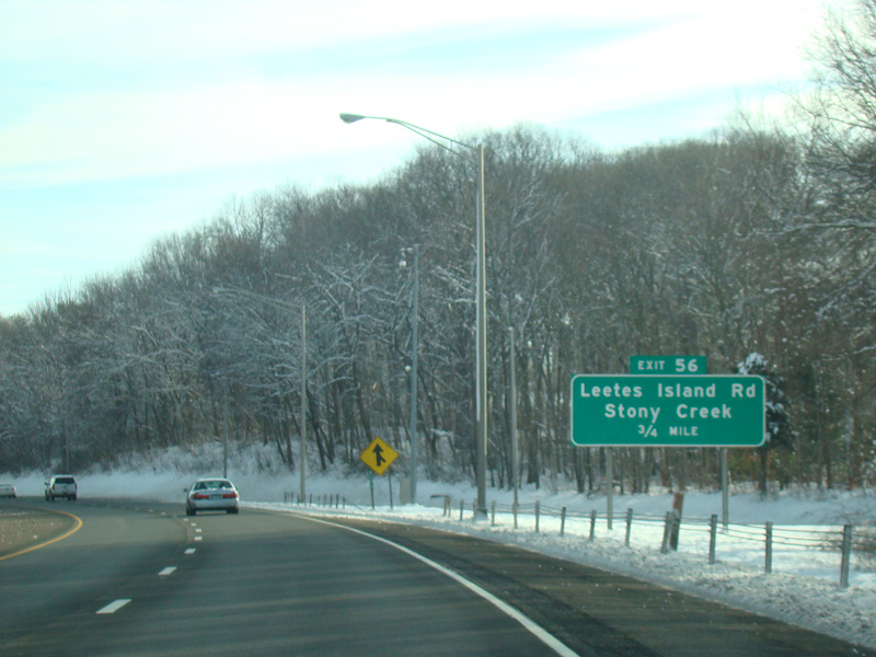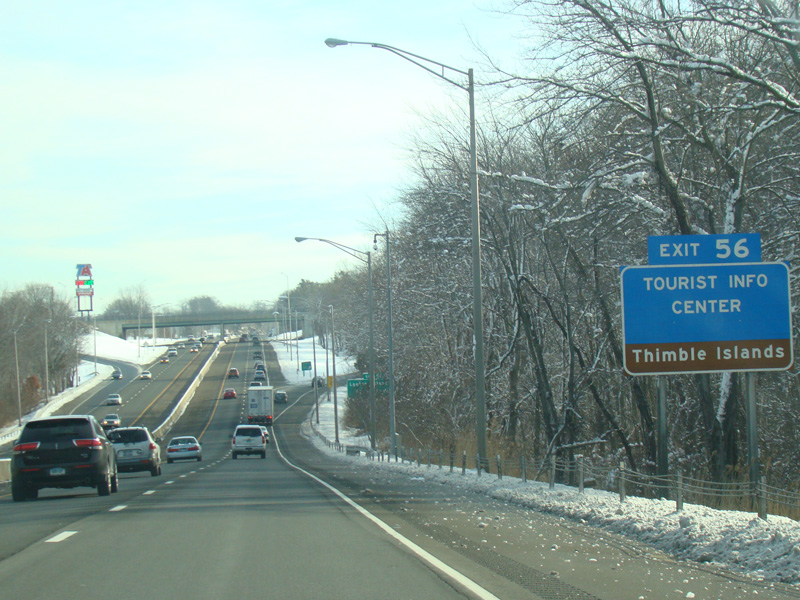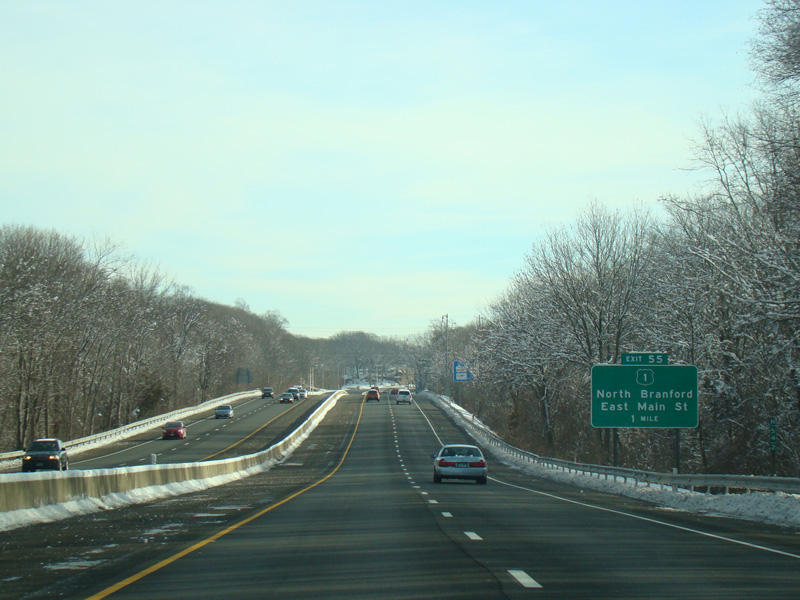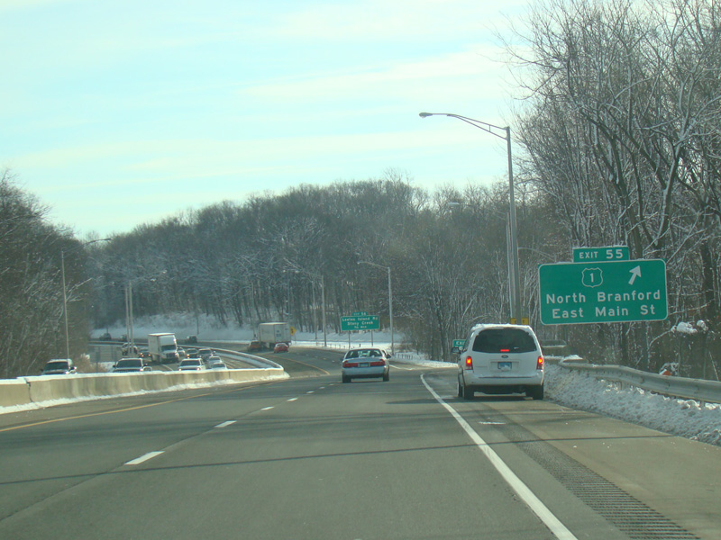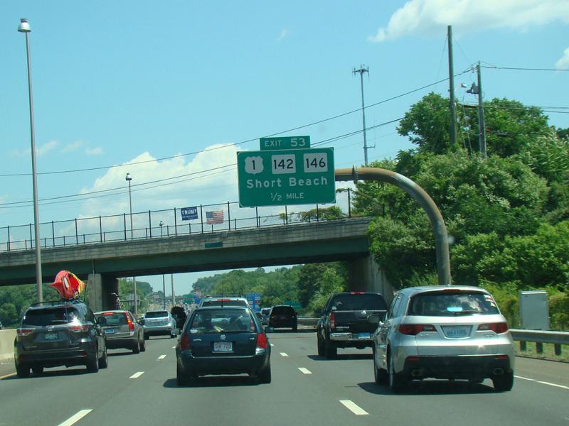 Exit 53 is for West Main Street (US 1), North Main Street (US 1), Short Beach Road (CT 142), and Main Street (CT 146).