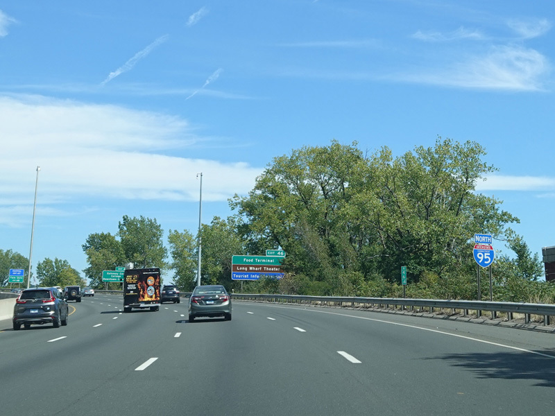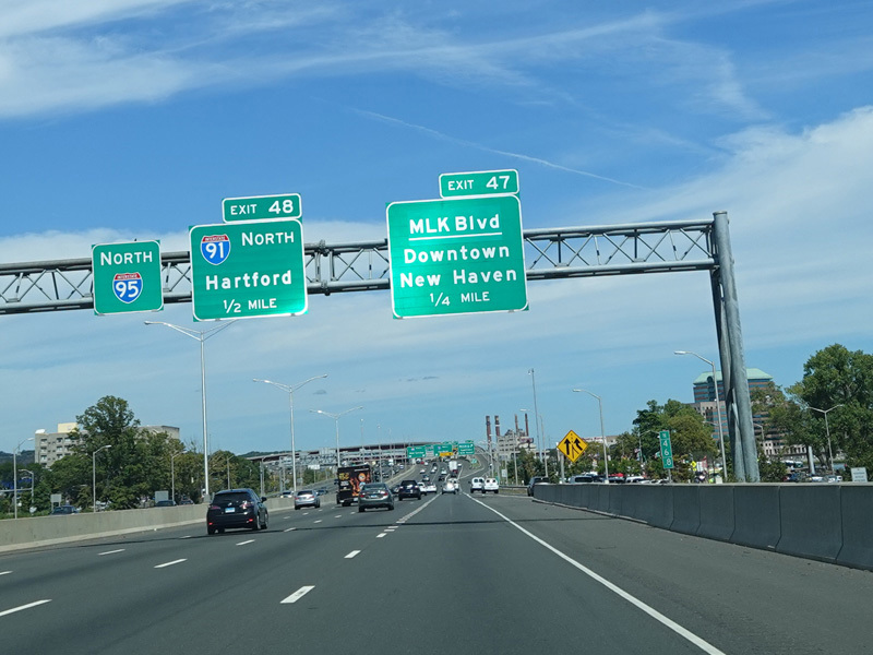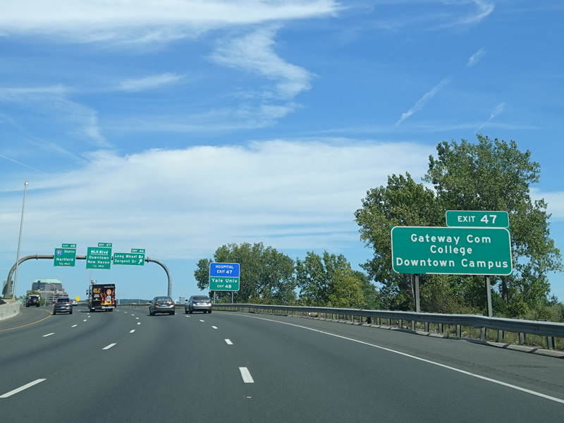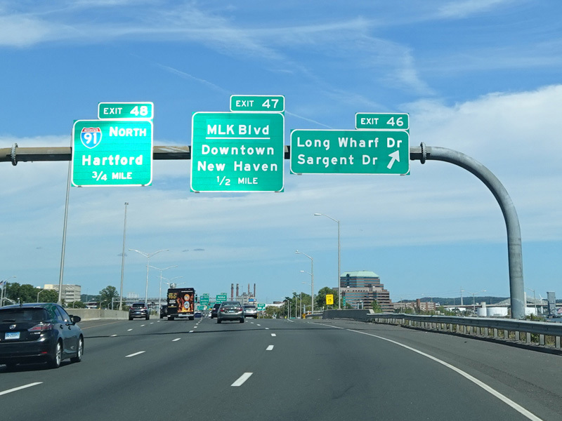 Exit 46 is for Long Wharf Drive and Sargent Drive. Exit 47 is for MLK Boulevard (CT 34) west. Exit 48 is for I-91 north.