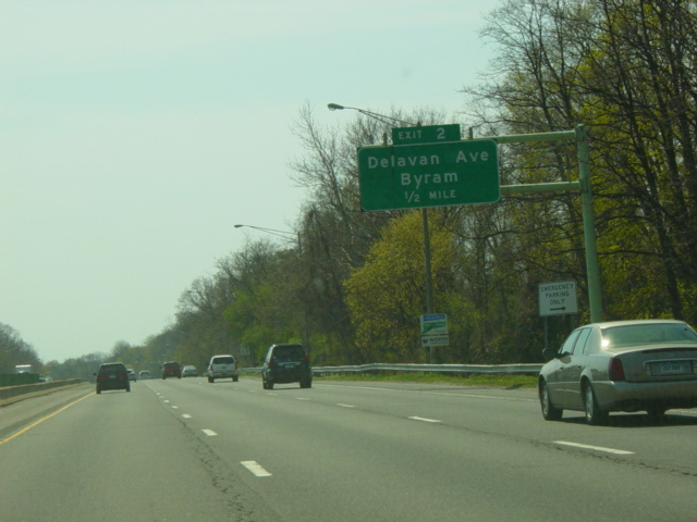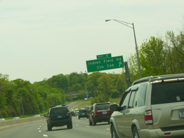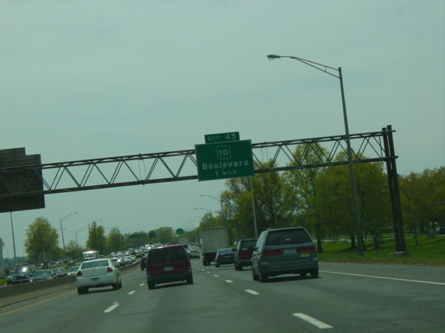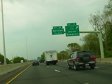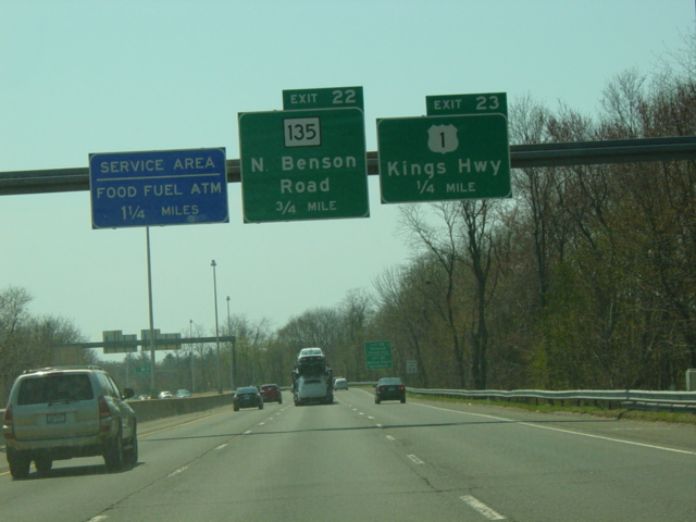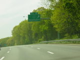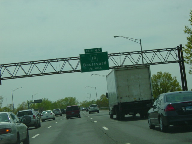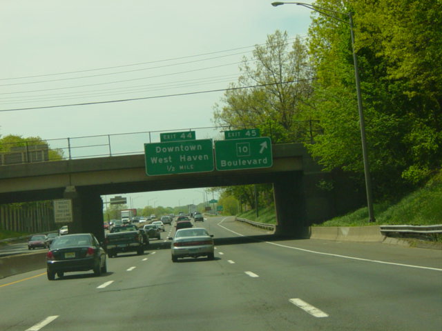 These pictures show the Connecticut Turnpike southbound at exits 46-43 as it appeared in 2007. What were then exits 45-44 were combined in a single exit 44, and all signs shown have been replaced.
