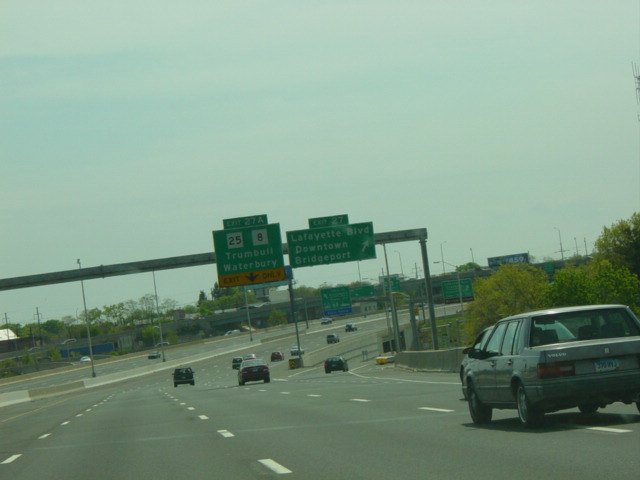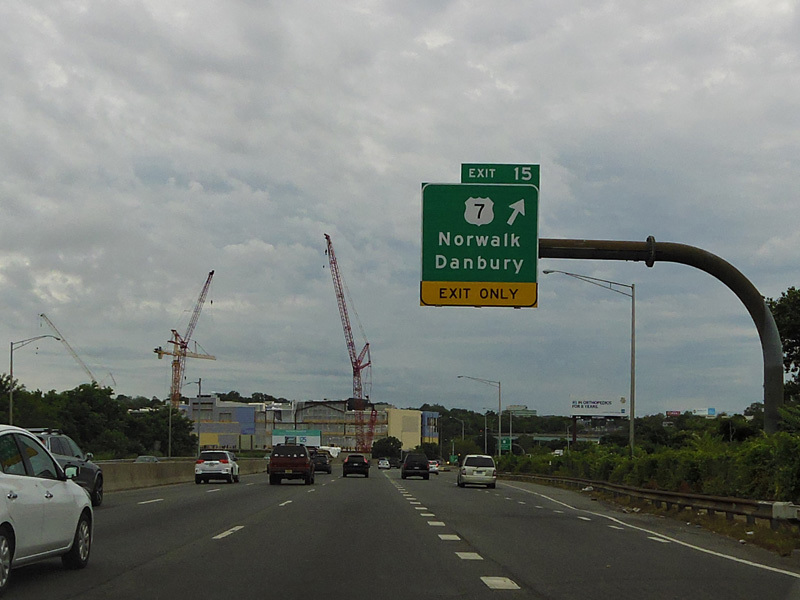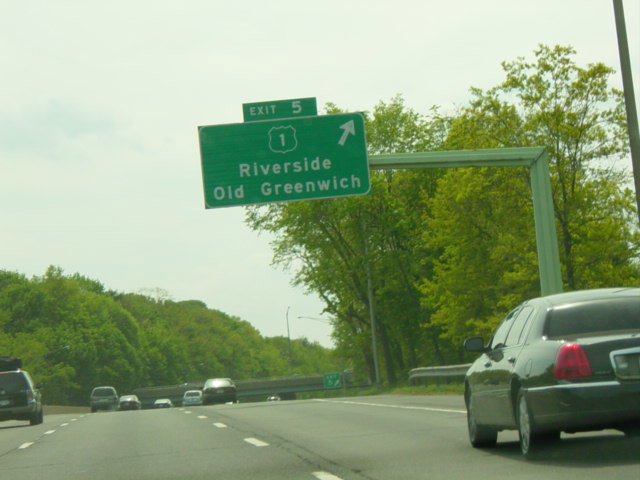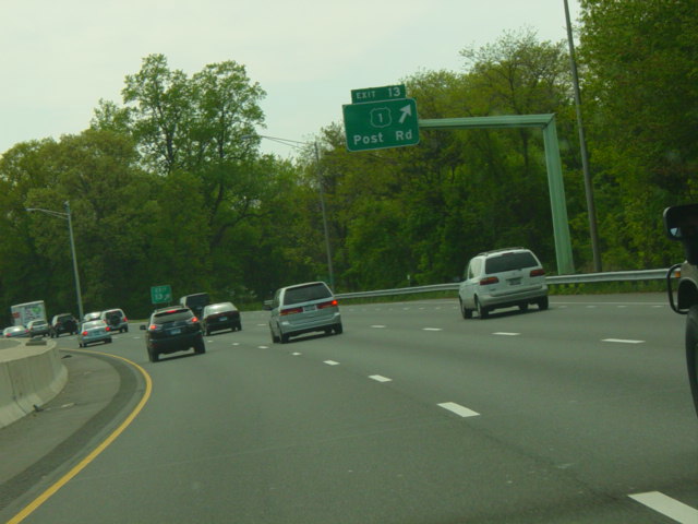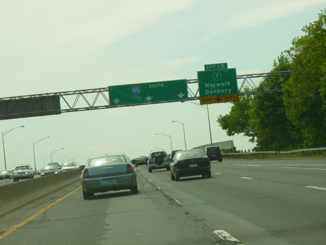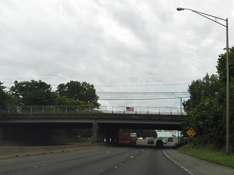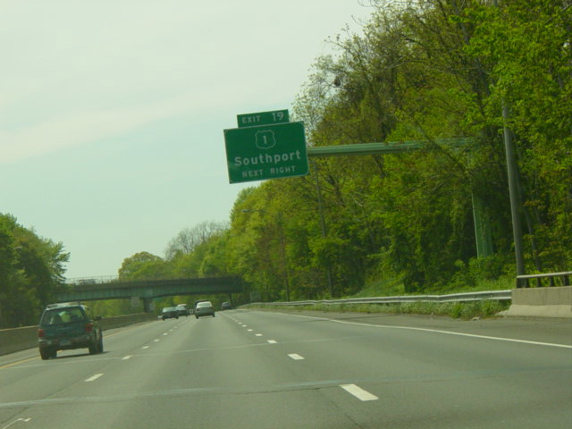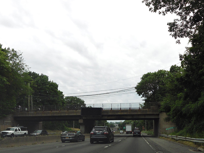 The large sign for I-95 on this sign bridge was replaced with a smaller one and a sign for the Fairfield Metro train station, which did not yet exist when this picture was taken.