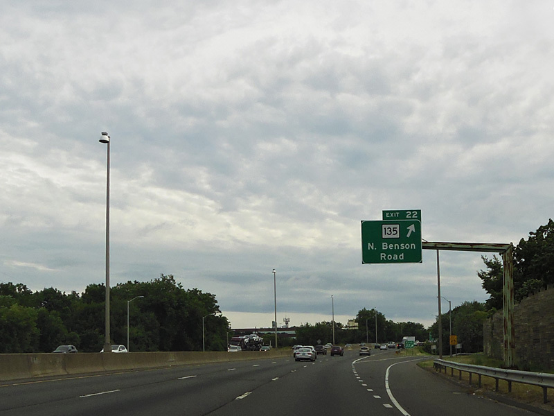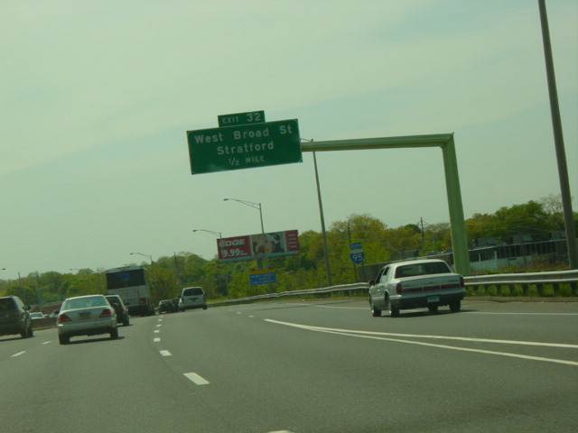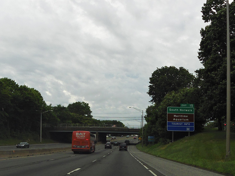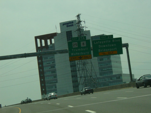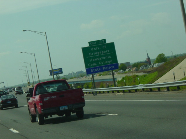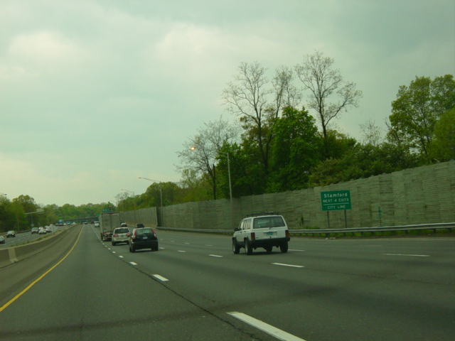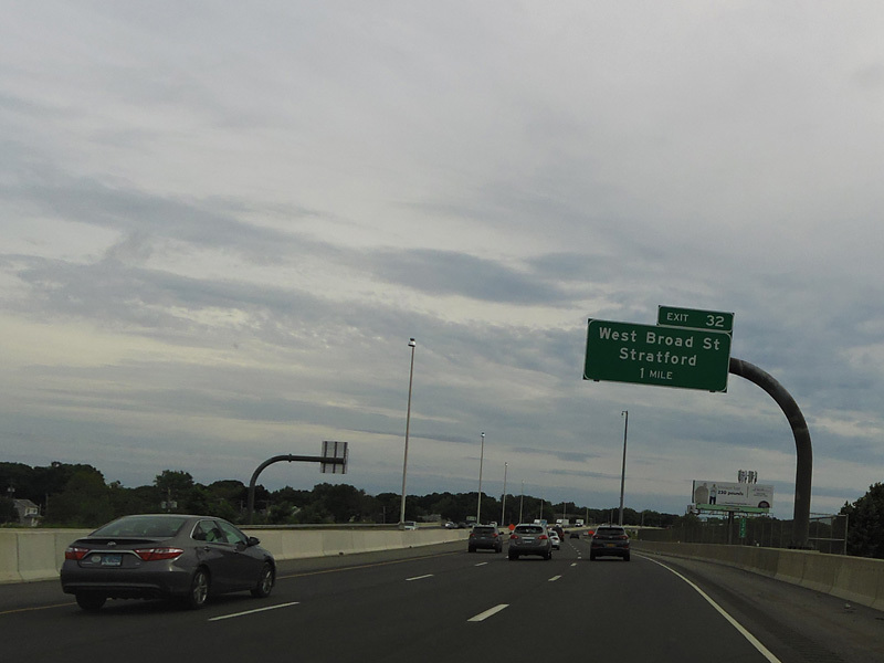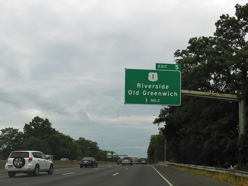 The large sign for I-95 on this sign bridge was replaced with a smaller one and a sign for the Fairfield Metro train station, which did not yet exist when this picture was taken.
