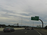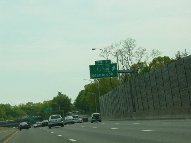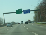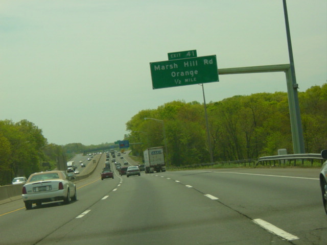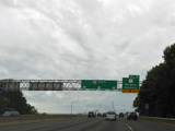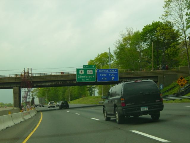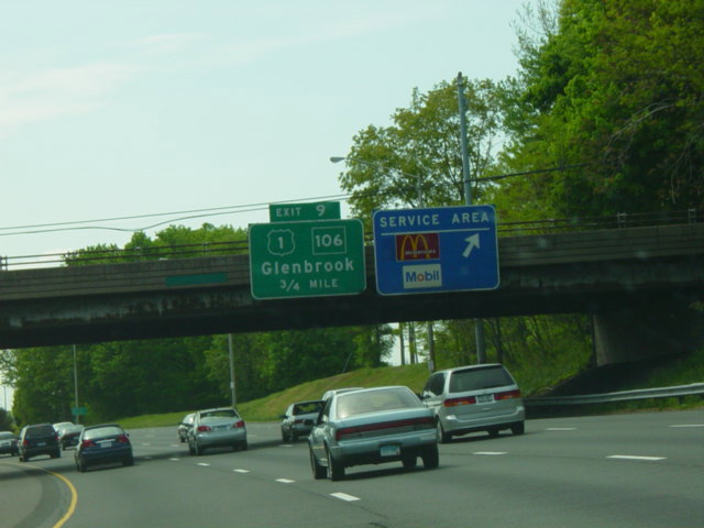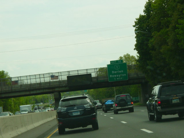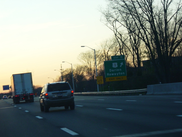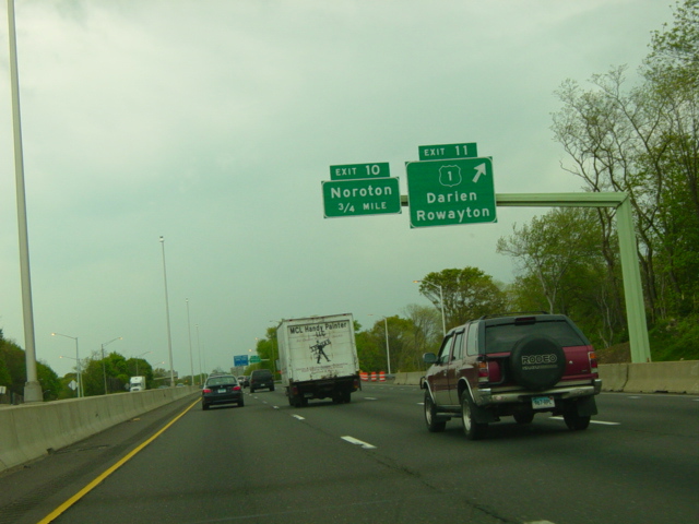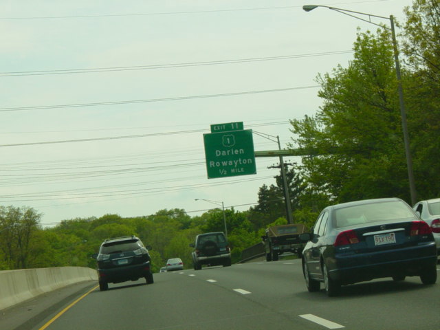 The Connecticut Turnpike was widened here in 2009 to add an exit only lane for exit 11. The signs shown in this picture were replaced to reflect this change.
