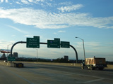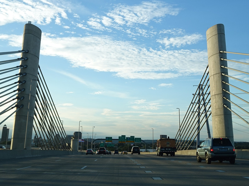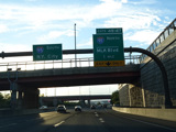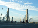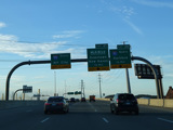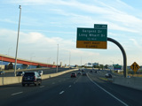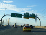 The Q Bridge carries the Connecticut Turnpike across New Haven Harbor. Exit 48 is for I-91 north. Exit 47 is for MLK Boulevard (CT 34) west.