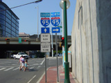 The SSR 493 designation begins at the Stamford railroad station. Immediately, there is an interchange with the Connecticut Turnpike (I-95). Take the first right to go north or the second left to go south.