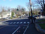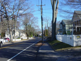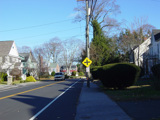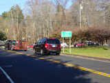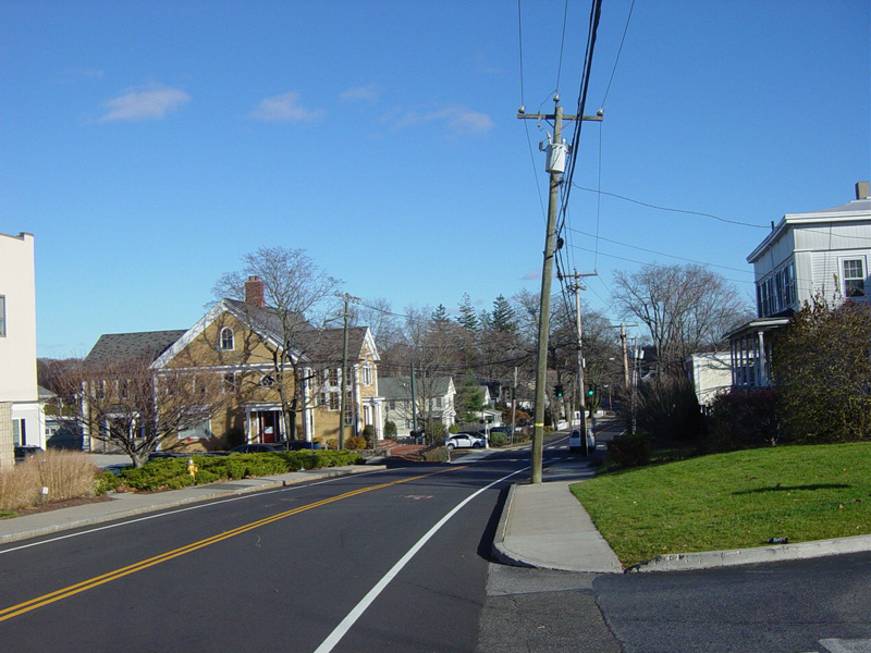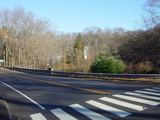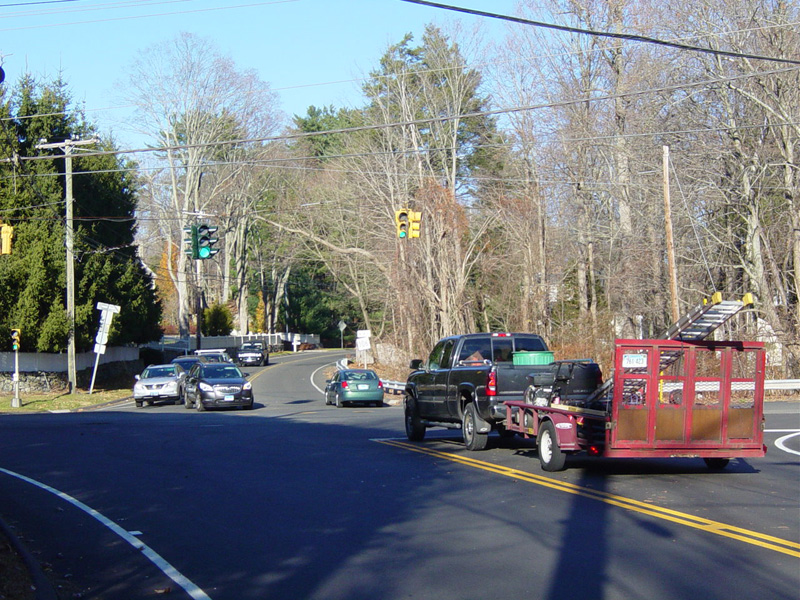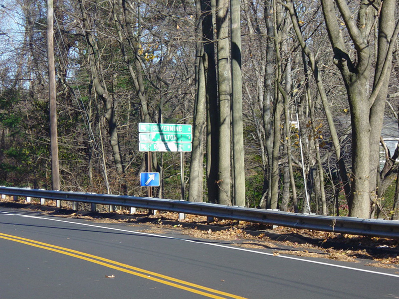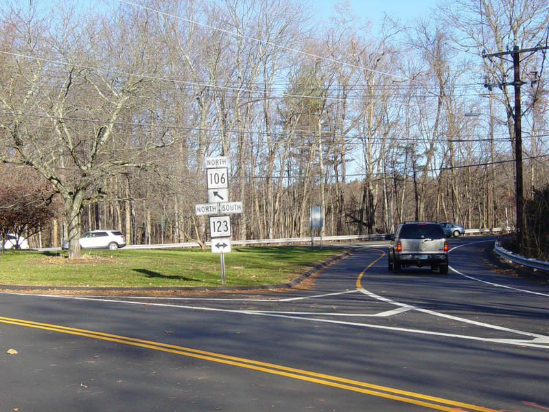 East Avenue ends here at New Norwalk Road (CT 123). Turn left to go north or right to go south. CT 106 continues straight ahead as Silvermine Road.