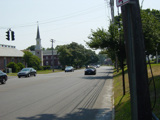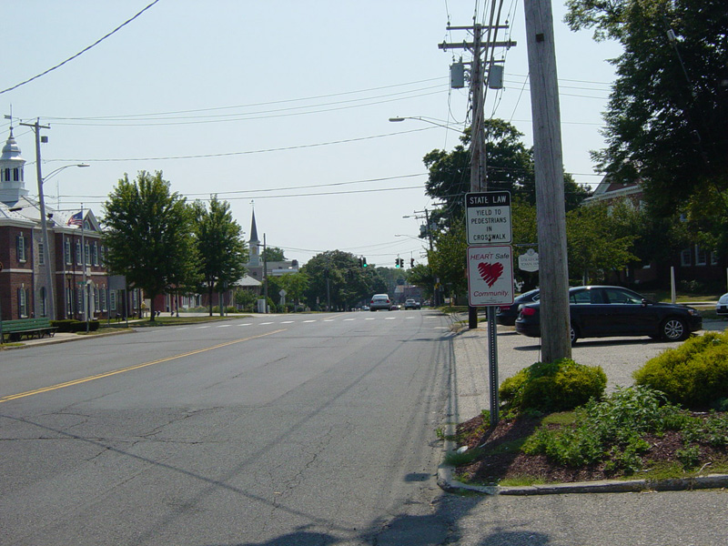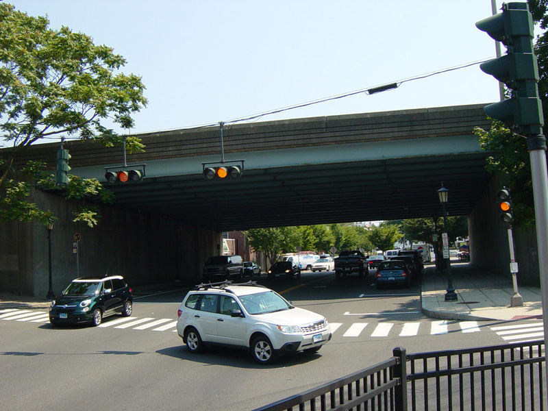 Main Street passes under the New Haven Line of the Metro-North Railroad and the Connecticut Turnpike (I-95). There is no interchange. The Stratford train station is to the left at the tracks.