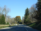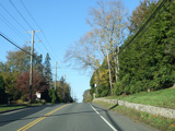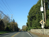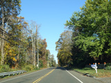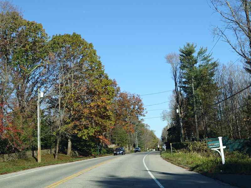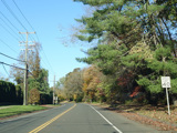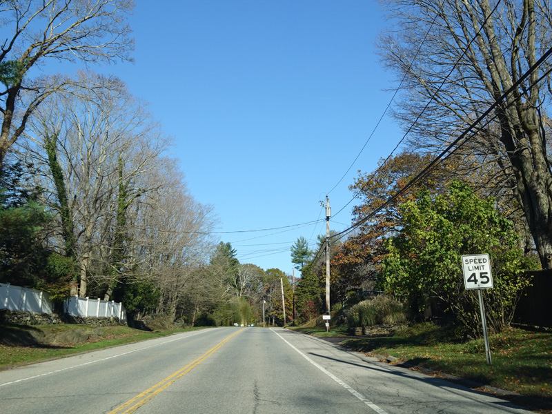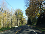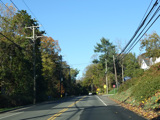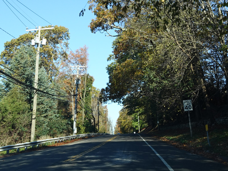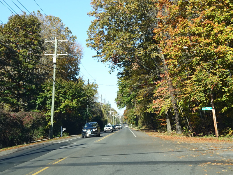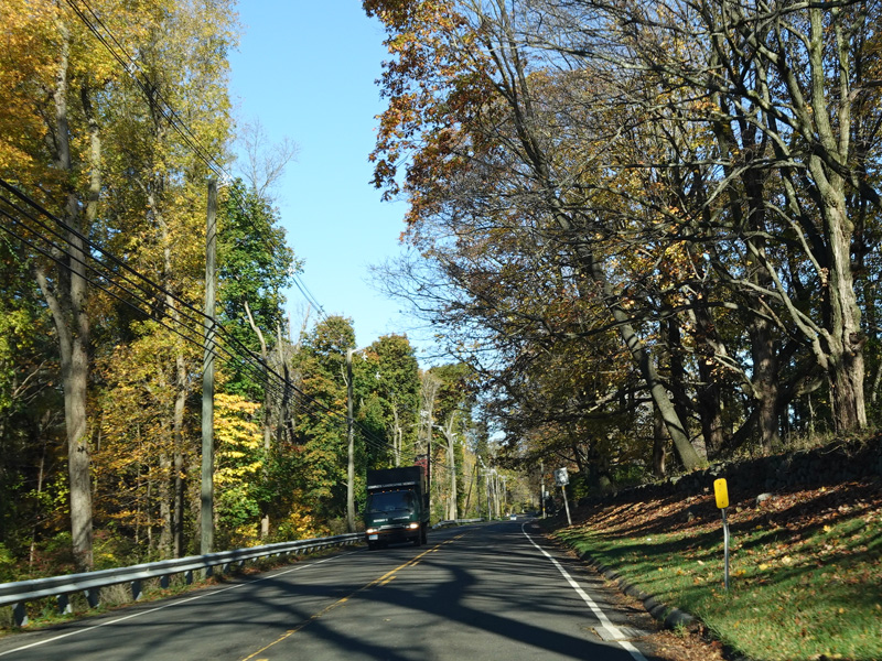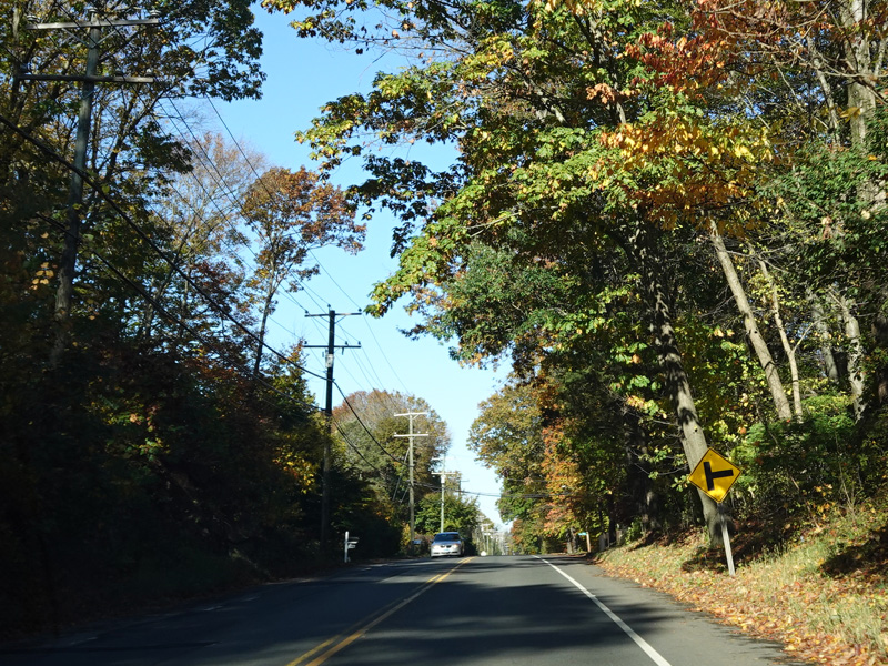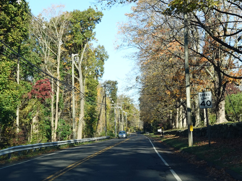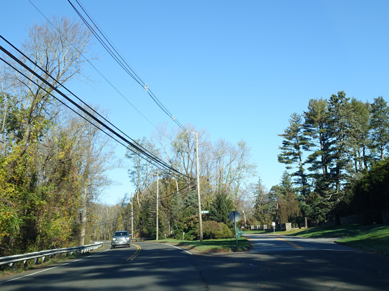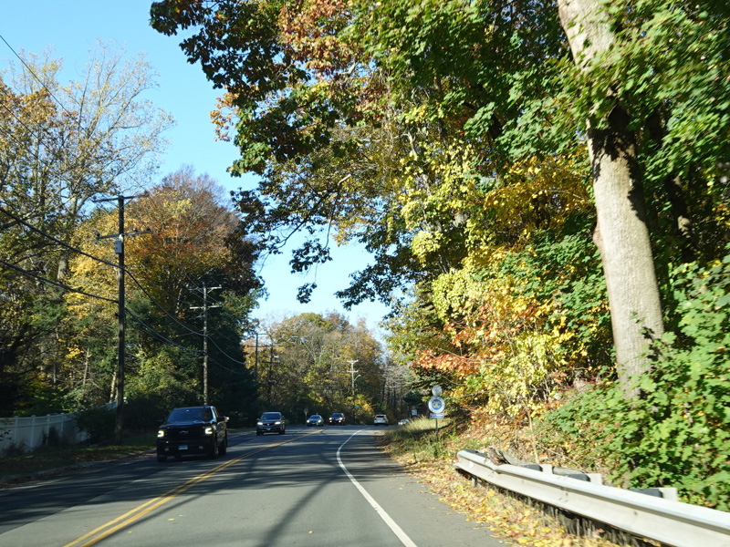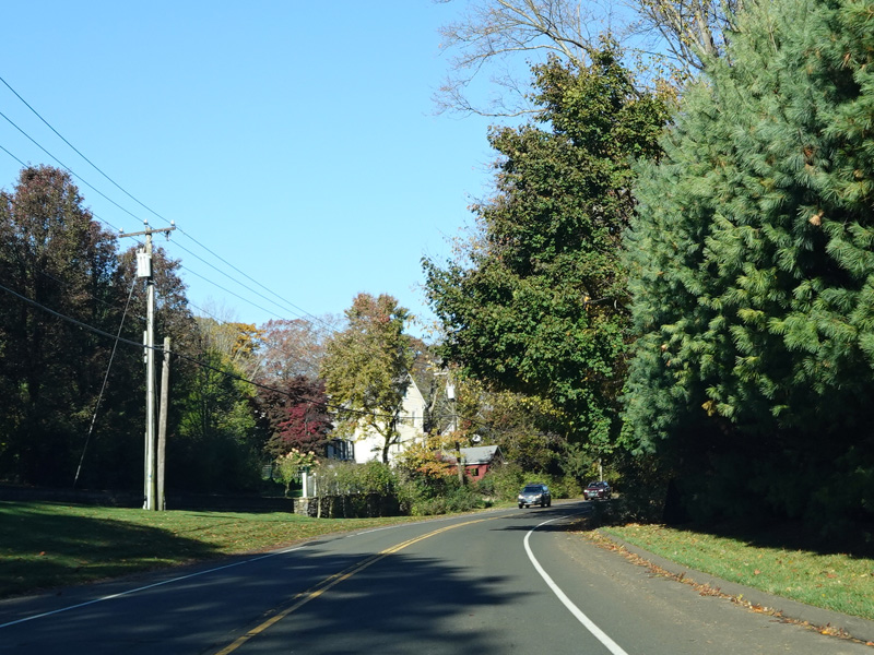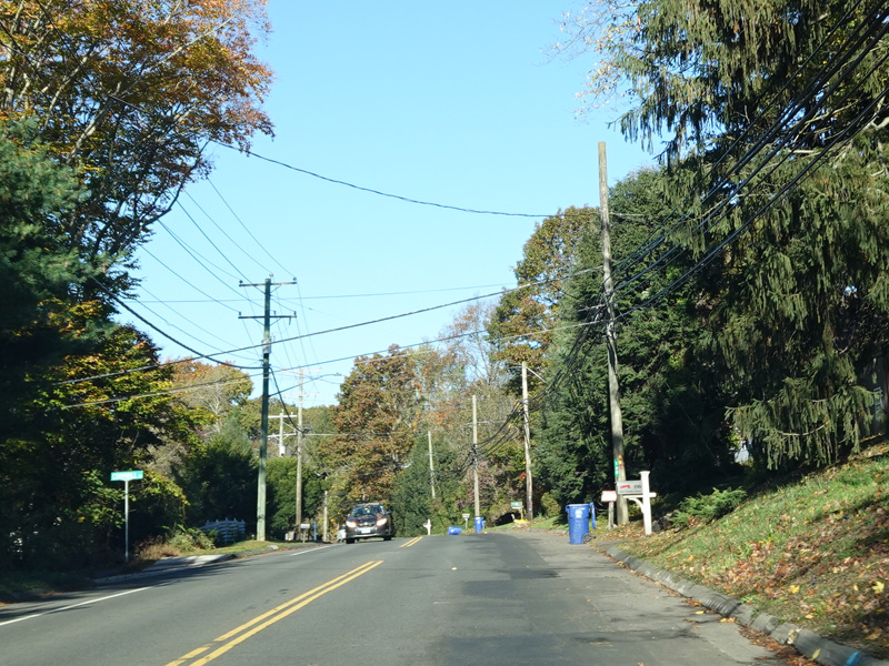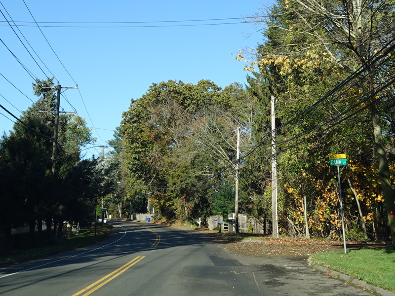 New Canaan Avenue runs northwest as a two-lane undivided road. Heading out of town, the surroundings become more wooded.
