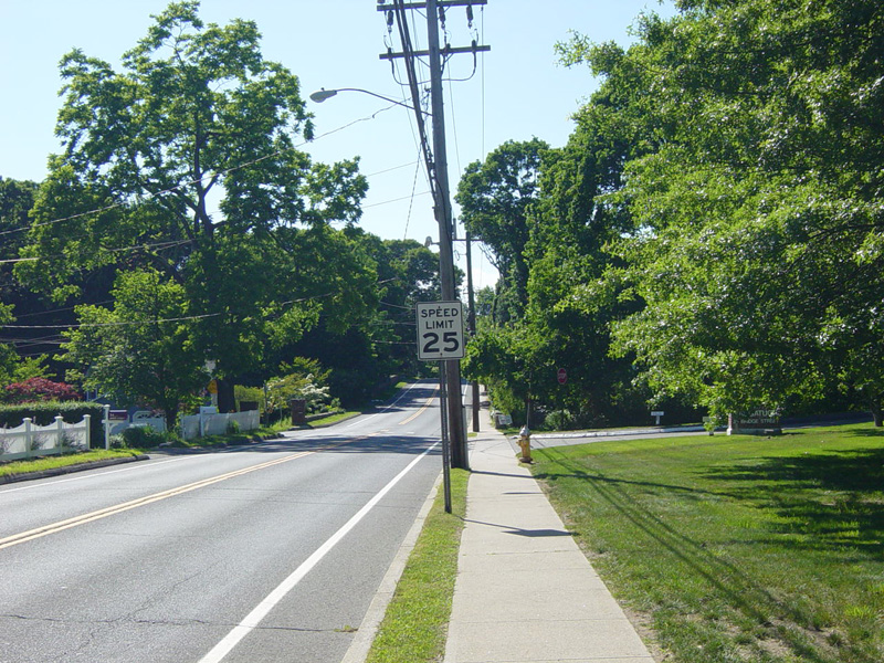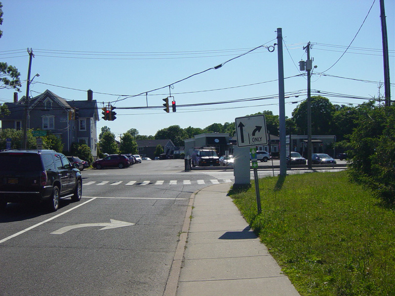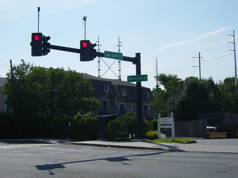 Van Zant Street ends here at Fort Point Street. Turn left to stay on CT 136. Route signage is missing at this intersection.