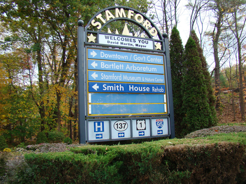 This Stamford welcome sign is located along High Ridge Road at the Merritt Parkway (CT 15). It contains an error in that CT 137 is marked as NJ 137.