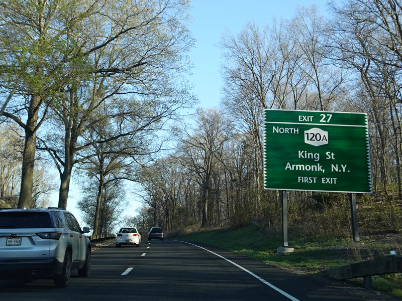 The Merritt Parkway ends at the New York-Connecticut state line, where it becomes the Hutchinson Parkway. There is a service plaza at the end of the parkway. The last exit, exit 27, is for King Street (NY 120A) north. Exit 27S, which is for King Street (NY 120A) south, is located on the Hutchinson Parkway immediately after the state line. All of signs are on the Connecticut side of the border, and it is numbered to be consistent with the Merritt Parkway's exit numbering scheme. When travelling north on the Hutchinson Parkway, this exit is marked as exit 19A.