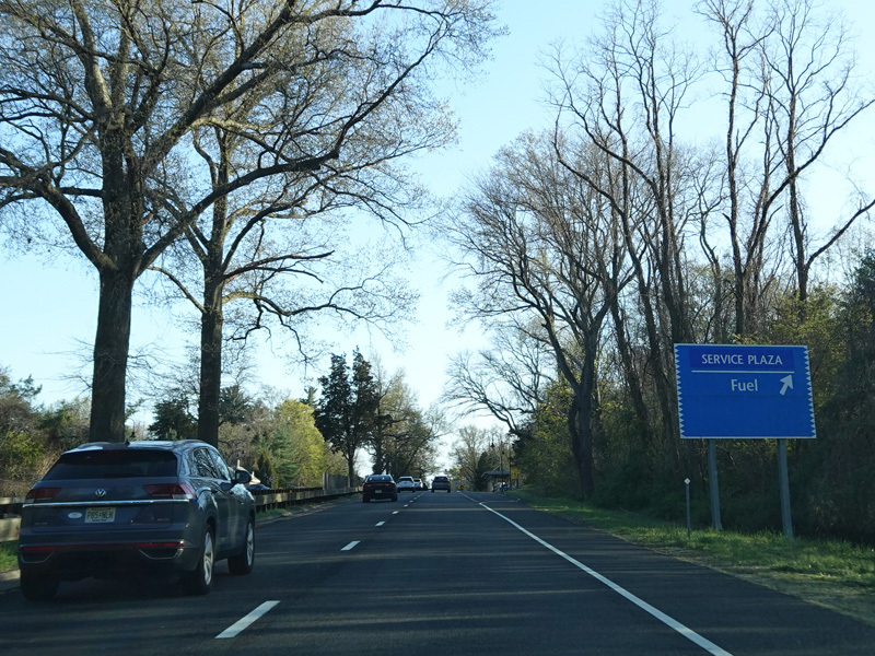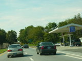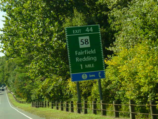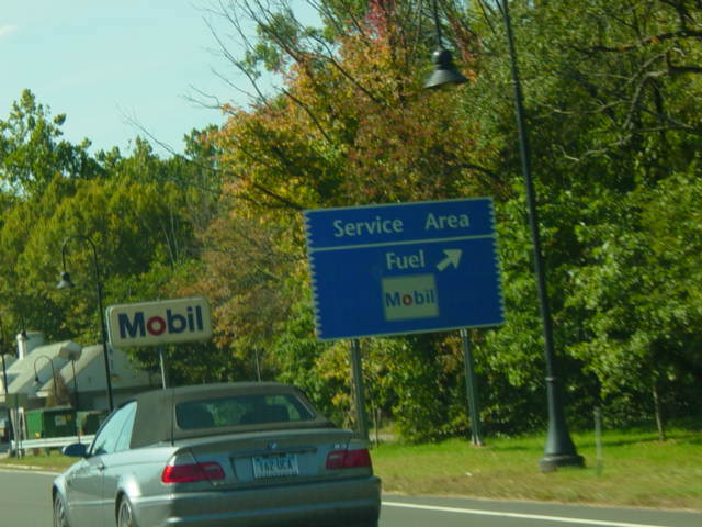 There is a Mobil gas station between exits 46 and 44. Exit 44 is for Black Rock Turnpike (CT 58).