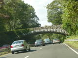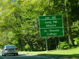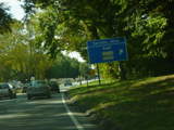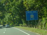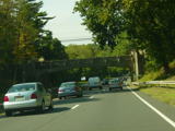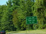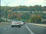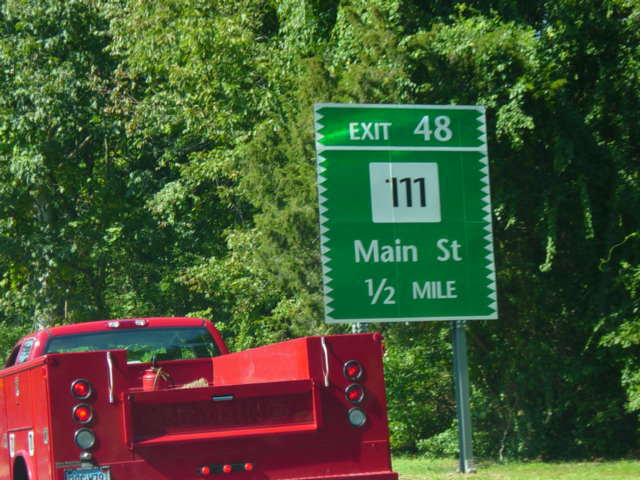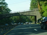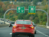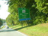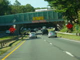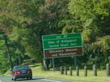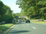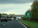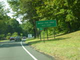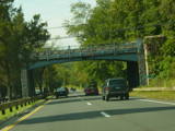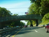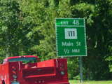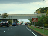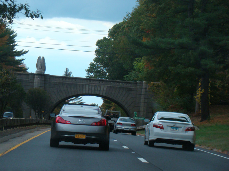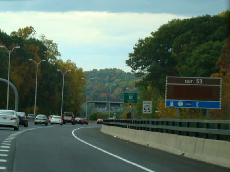 Welcome to the Merritt Parkway! This parkway has its own distinctive style of signage intended to emphasize the rustic feel. The Sikorsky Bridge carries the parkway across the Housatonic River to Fairfield County. On the other side, exit 53 is for Main Street (CT 110).