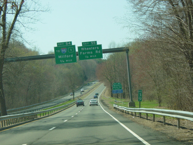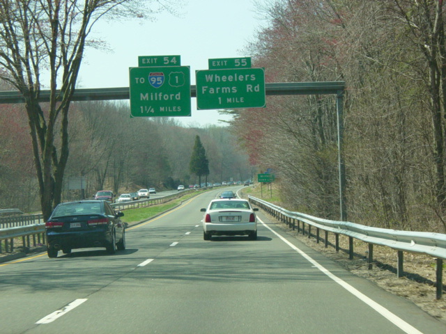 Exit 55 is for Wheelers Farms Road. Exit 54 is for the Connecticut Turnpike (I-95) and Boston Post Road (US 1). The exit leads to the Milford Parkway (SR 796), which in turn has exits for I-95 and US 1. The Wilbur Cross Parkway ends here. CT 15 continues straight ahead as the Merritt Parkway.