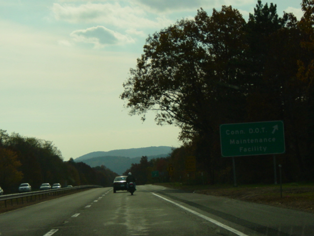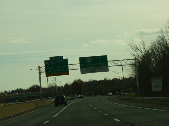 The Wilbur Cross Parkway splits off from I-91 and runs southwest. There is an unnumbered exit for the Connecticut DOT Maintenance Facility.