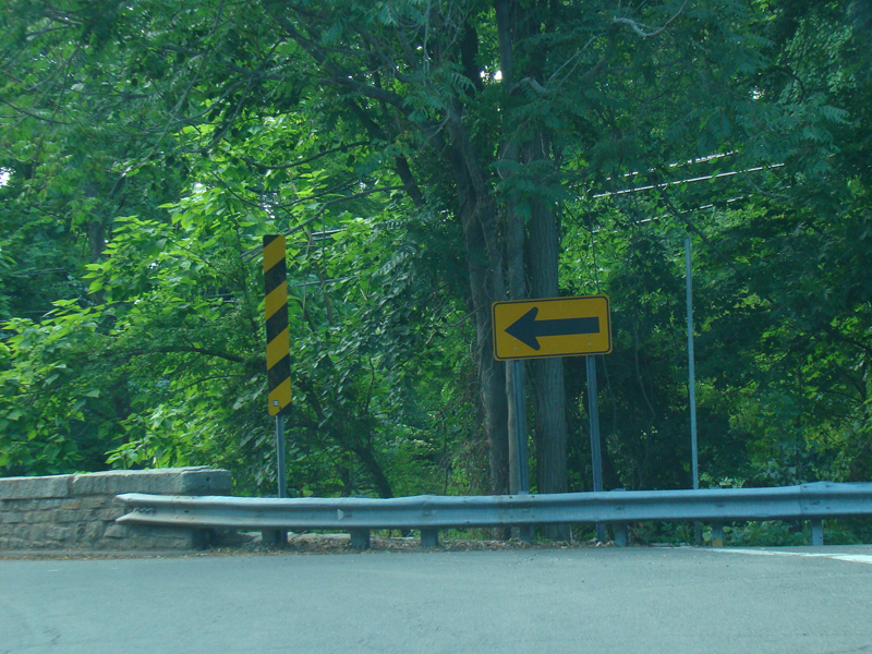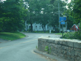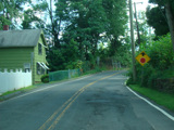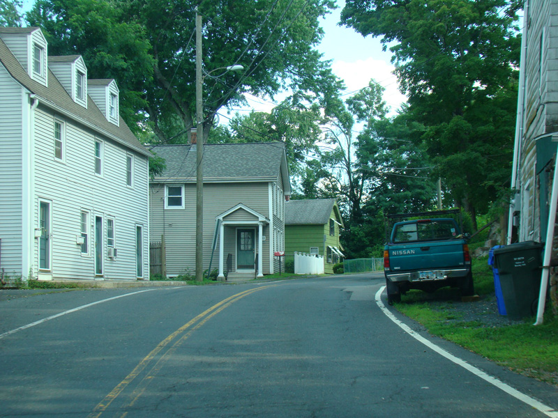 Water Street curves to the left and becomes Tryon Street. There is a small bridge over Roaring Brook.