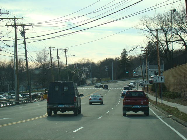 Saw Mill Road widens to four lanes. There is an interchange with the Connecticut Turnpike (I-95).