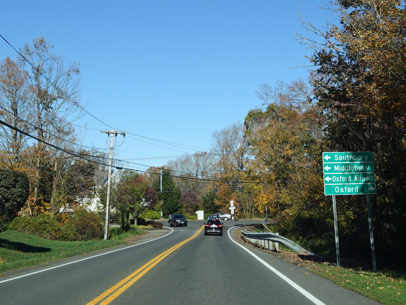 Quaker Farms Road ends at a traffic light at Southford Road (CT 67). Turn left to go north and to stay on CT 188. Turn right to go south.