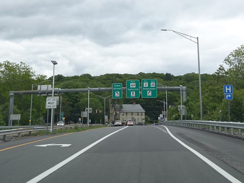 The expressway ends after exit 29 at a traffic light. Turn right onto Washington Street to stay on CT 2/CT 32. Turn left for Town Street. Harland Road (CT 169) begins straight ahead.