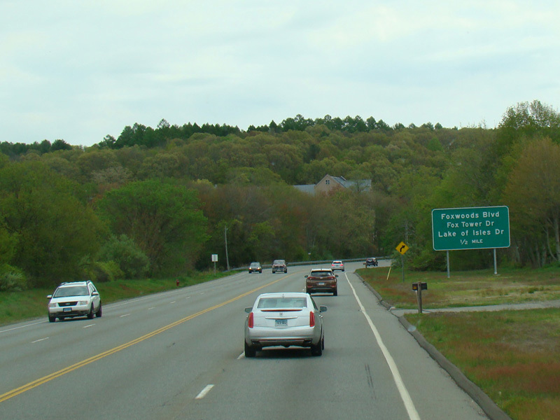 In the vicinity of Foxwoods, Norwich-Westerly Road widens to four lanes and becomes an expressway. There is an exit for Foxwoods Boulevard (SR 680), Fox Tower Drive, and Lake of Isles Drive.