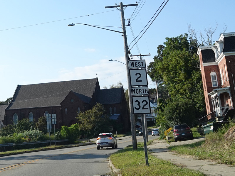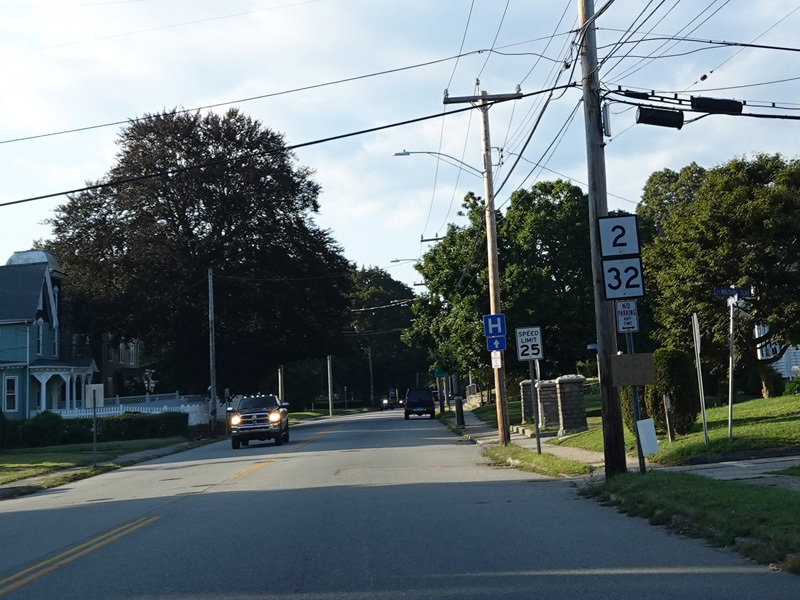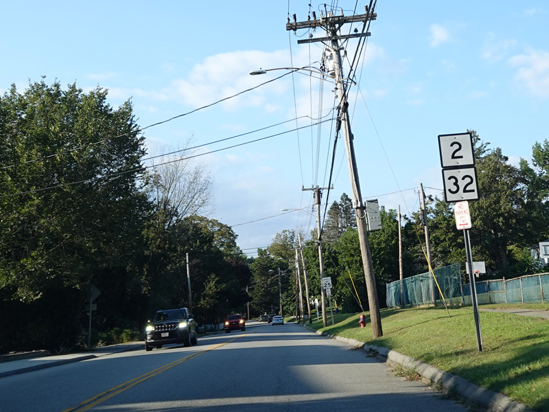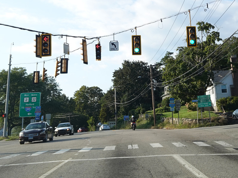 Turn left at this traffic light to stay on CT 2/CT 32. Harland Road (CT 169) begins on the right.
