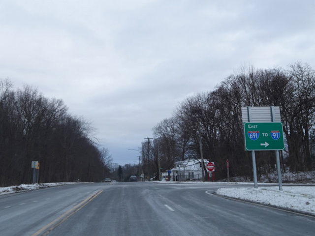 CT 322 is an east/west route extending from Wolcott to Southington, near the border with Meriden. It begins at Wolcott Road (CT 69) and follows Center Street, County Road, and East Street to the southeast before turning east onto Meriden Road, which changes names to become Meriden-Waterbury Turnpike upon entering Southington. There is an interchange with the Yankee Expressway (I-84) just north of the point where I-691 splits off. Meriden-Waterbury Turnpike continues east, running to the north of I-691, and then curves to the southeast to end at exit 5 of I-691. There, it becomes West Main Street, an unnumbered town road.
