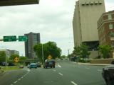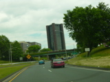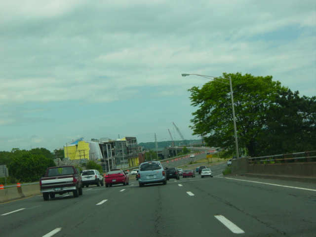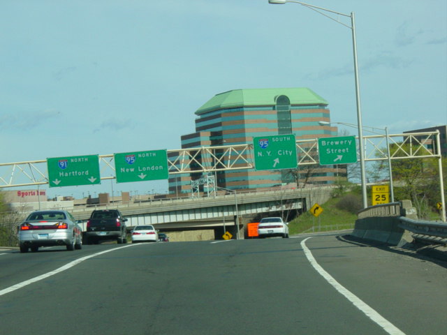 These pictures show the Oak Street Connector as it appeared before it was constructed. It has since been shortened to begin at South Orange Street, and the interchange with the Connecticut Turnpike (I-95) and I-91 has been rebuilt, providing two lanes to each highway in the northbound direction.