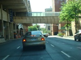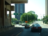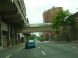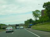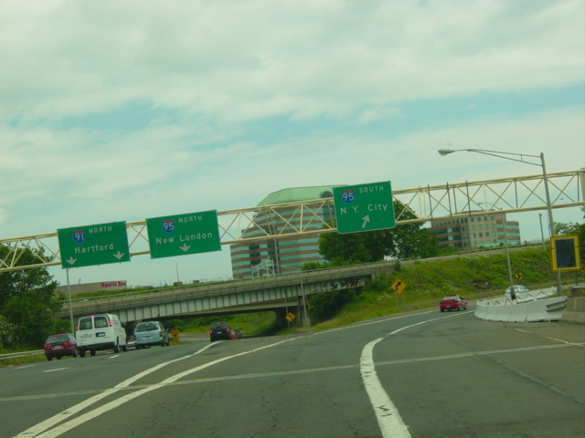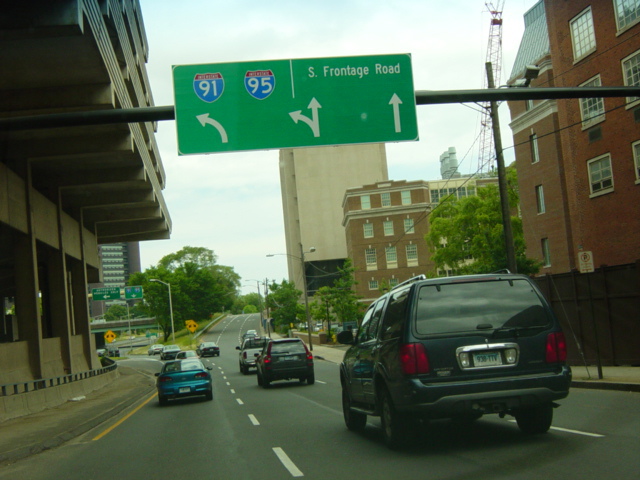 These pictures show South Frontage Road in New Haven as it appeared prior to the reconstruction of the Oak Street Connector. The split that is shown no longer exists. South Frontage Road now transitions into the Oak Street Connector several blocks east of here at South Orange Street.