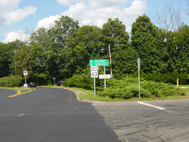 CT 63 is a north/south route extending from New Haven to Canaan in the northwest corner of the state. It begins at the point where CT 10 turns from Whalley Avenue onto Fitch Street. CT 63 follows Whalley Avenue until just before its interchange with the Wilbur Cross Parkway (CT 15). There, Whalley Avenue splits off to become CT 69, while CT 63 continues to the north as Amity Road. In Bethany, Amity Road curves to the west and becomes New Haven Road. Amity Road runs west toward Naugatuck, where it curves to the north and becomes South Main Street. At an interchange with the CT 8 expressway, CT 63 leaves South Main Street and turns west again, crossing a bridge over the Naugatuck River. On the other side, it merges into Cherry Street. CT 63 changes names a few times as it passes through Naugatuck from Cherry Street to Meadow Street to Church Street.