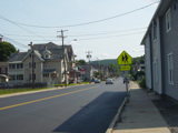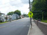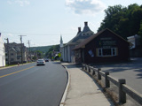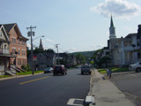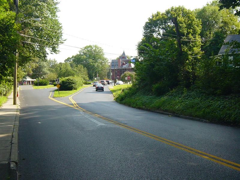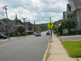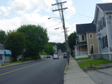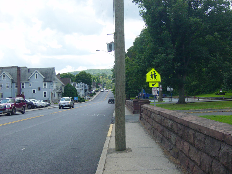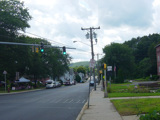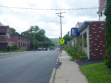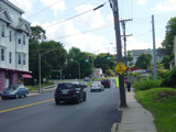 There is a stop sign. Church Street splits off to the left to become a local street. Continue straight ahead onto Meadow Street to stay on CT 63.