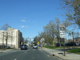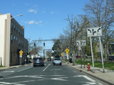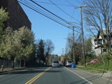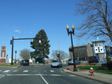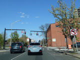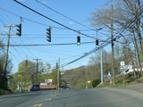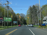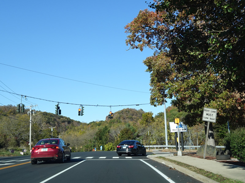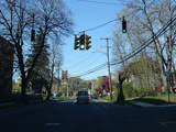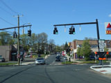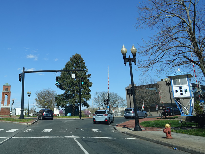 To stay on CT 71, bear left at this traffic light onto Colony Street and then left again onto West Main Street. The Meriden Traffic Control Tower is visible on the right.