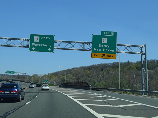 CT 8 is a major north/south expressway in Connecticut. It begins at the Connecticut Turnpike (I-95) in Bridgeport. It is multiplexed with CT 25 for the first few miles, but the two routes split just south of the Merritt Parkway (CT 15). CT 8 runs to the northeast across the Housatonic River to Derby. It then runs north to Naugatuck and Waterbury and then into Litchfield County. The section of CT 8 in Naugatuck is called the Ansonia-Derby Expressway; elsewhere, the expressway has no name. CT 8 is the only limited-access highway in Litchfield County. The expressway ends at South Main Street (US 44) in Winsted. At this point, CT 8 is multiplexed along US 44 westbound for a few blocks before splitting off onto Park Place East, which becomes North Main Street and then Colebrook River Road. CT 8 ends at the Connecticut-Massachusetts state line, where it becomes MA 8.