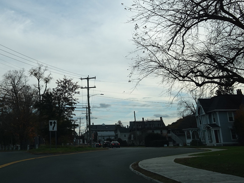 Main Street changes names to become Park Place and becomes a divided road with a grass median. After one block, Park Place ends at Main Street (US 44/CT 183). Turn left to go east and to stay on CT 8. Turn right to go west.