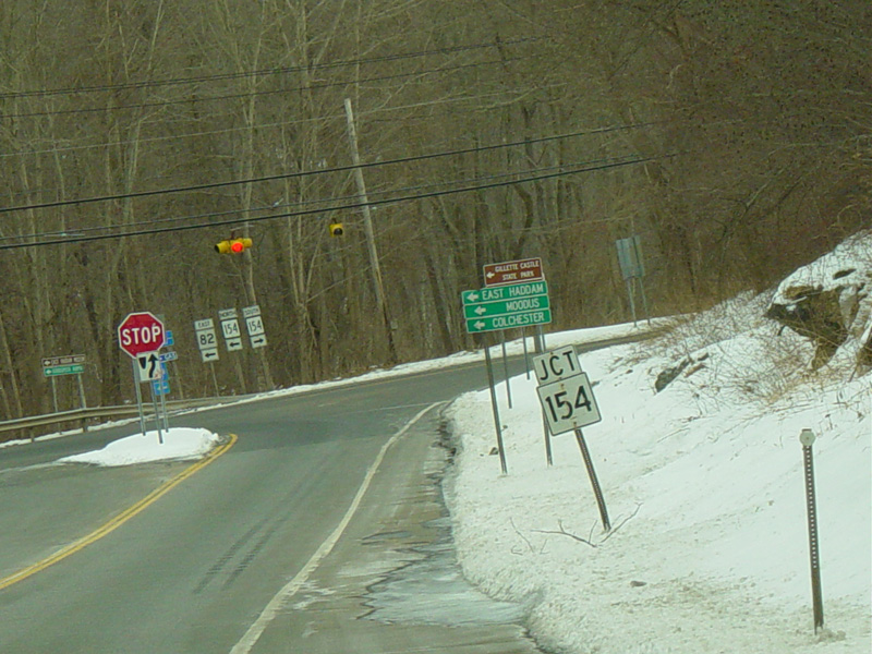 The highway ends at Middlesex Turnpike (CT 154). The intersection is marked by a stop sign and a flasher. Turn left to go north or turn right to go south. Eastbound CT 82 is multiplexed with northbound CT 154 for a short distance here.