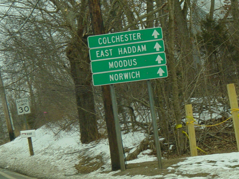 Welcome to Salem! Norwich-Salem Road changes names to become East Haddam Road.