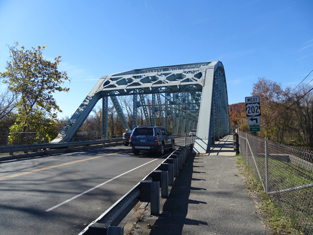 In New Milford, Federal Road changes names to become Danbury Road. The US 7/US 202 multiplex continues for a few miles, and then US 202 splits off onto Bridge Street, crossing the Housatonic River on the Veterans Memorial Bridge. US 202 runs north, gradually curving to the east, through Litchfield and Torrington. Eventually, it reaches Canton, where it joins US 44. The two routes are multiplexed along Albany Turnpike to Avon, where US 202 splits off and turns north onto Simsbury Road (CT 10). US 202 and CT 10 are multiplexed along Simsbury Road, Hopmeadow Street, and Salmon Brook Street to the border with Massachusetts. US 202 continues across the state line, while CT 10 becomes MA 10.
