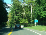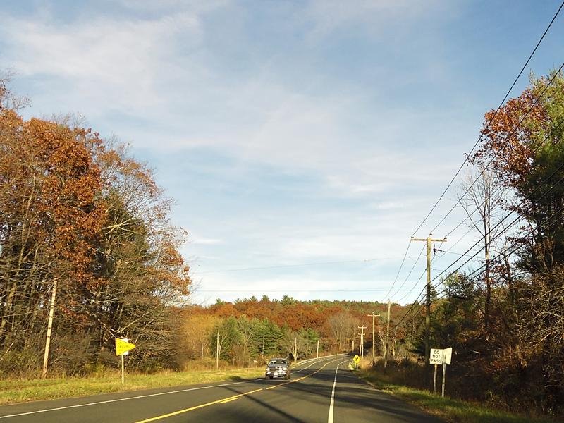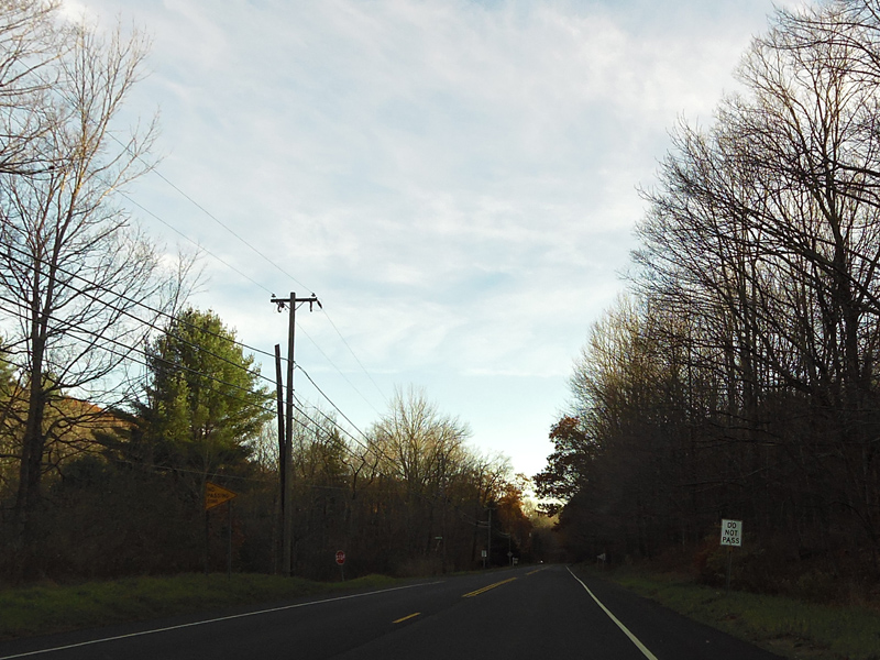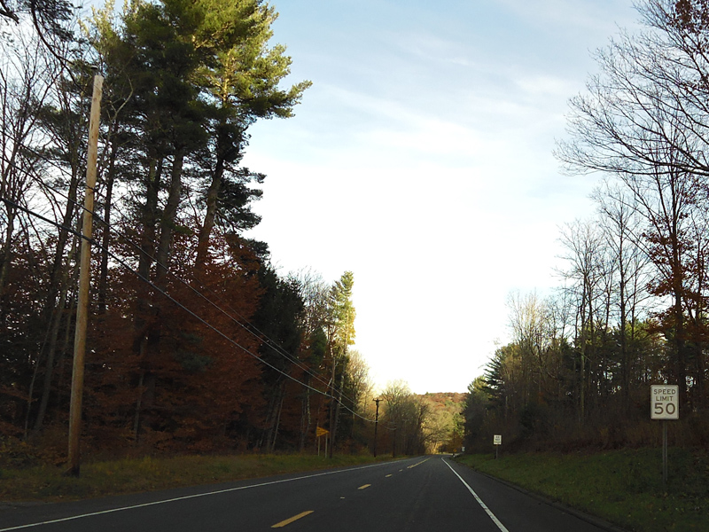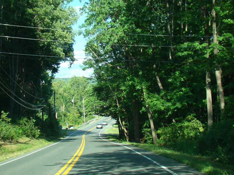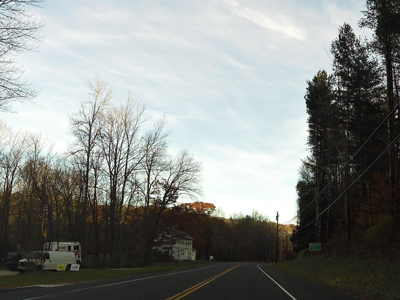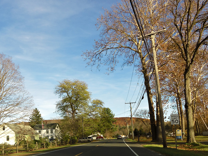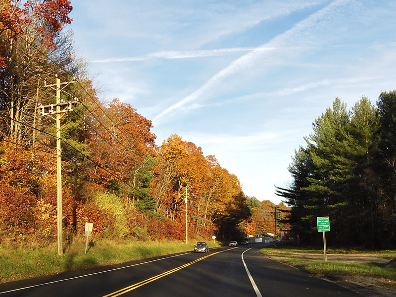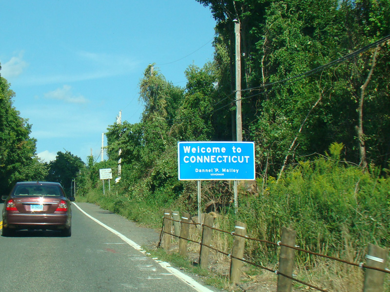 Welcome to Connecticut! Millerton Road runs east as a two-lane undivided road.