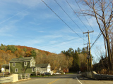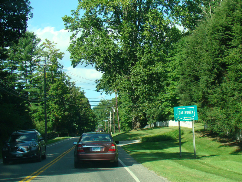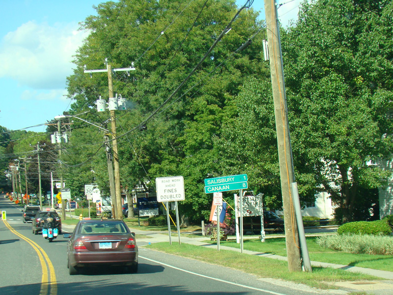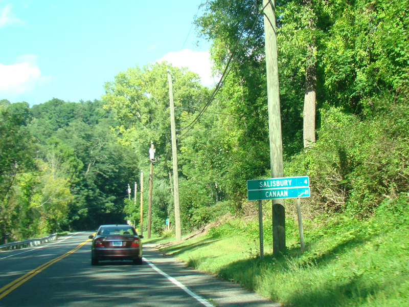 There is a small bridge over the Housatonic River, and Canaan Road changes names to become Salisbury Road. Belden Street (CT 126) begins on the right.