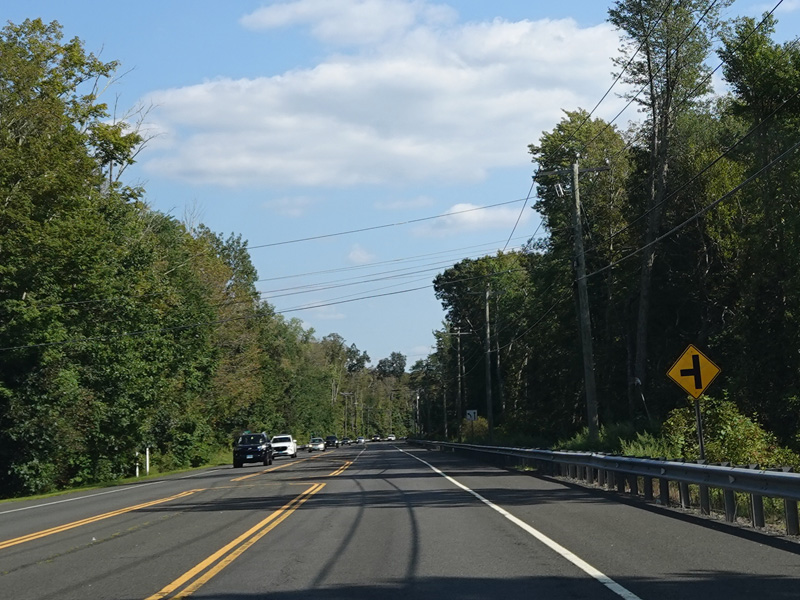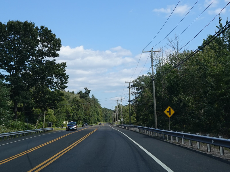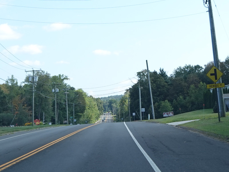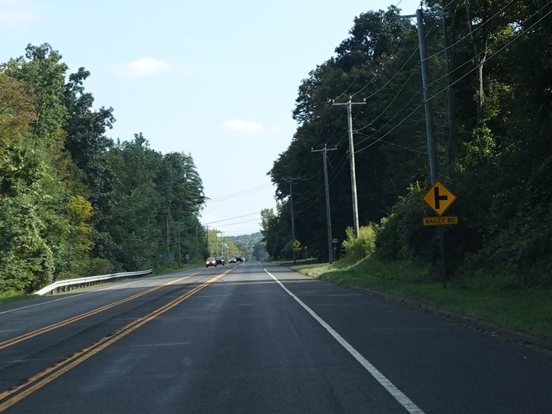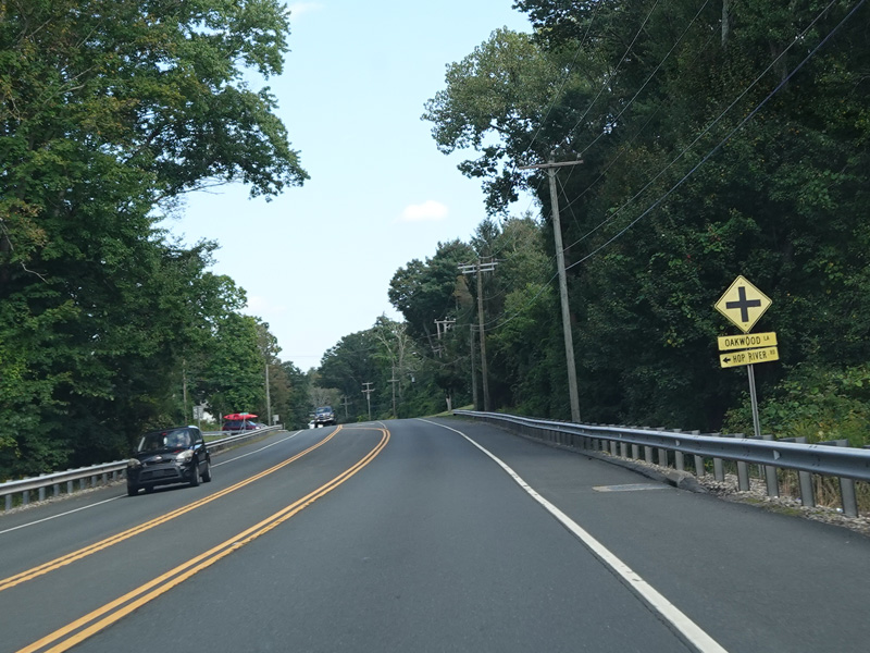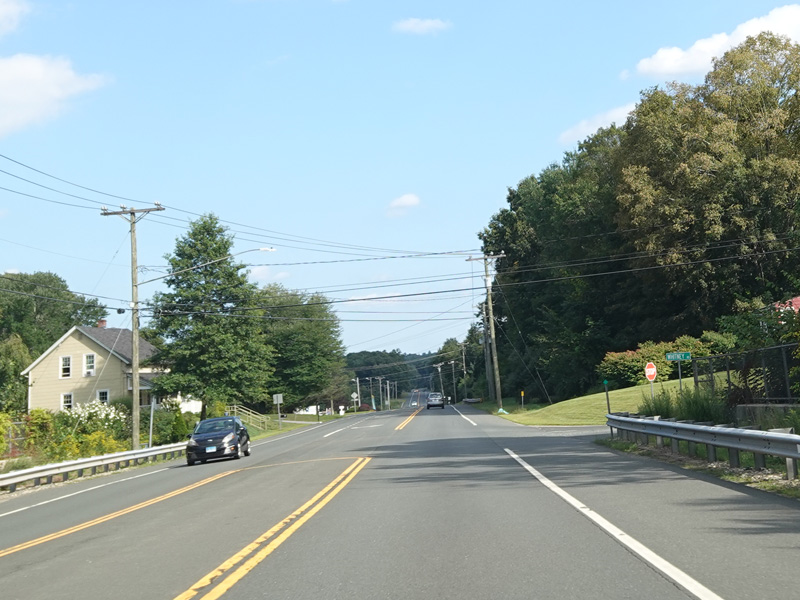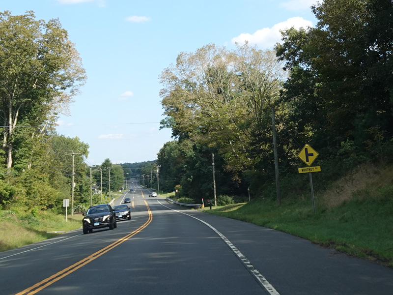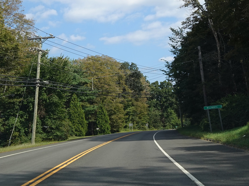 Welcome to Coventry! Hop River Road changes names to become Willimantic Turnpike. There are uncontrolled intersections at Bailey Road, Hendee Road, Aspinall Drive, and Wales Road.