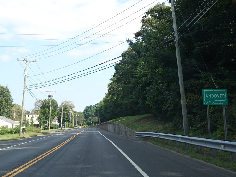 Welcome to Andover! Willimantic Turnpike changes names to become Jonathan Trumbull Highway.