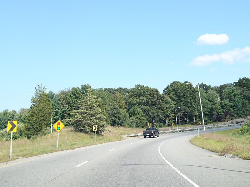 The roadway makes a sharp curve around to the right before ending at a traffic light at Boston Post Road. Turn right to stay on US 6. Turn left to go west on CT 66, which begins here.