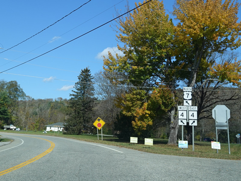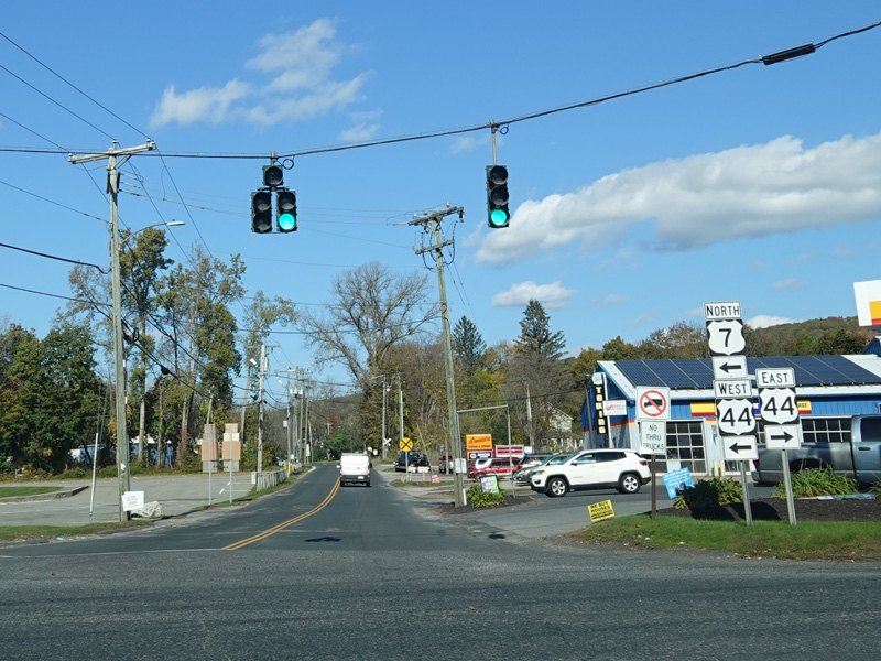 There is a traffic light at Main Street (US 44). Turn right to go east. Turn left to go west and to stay on US 7.