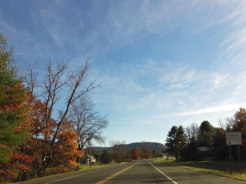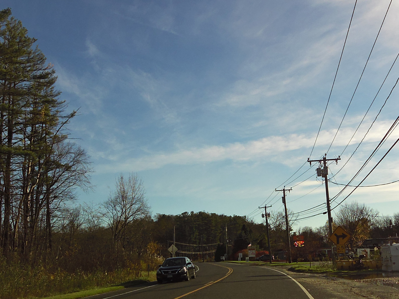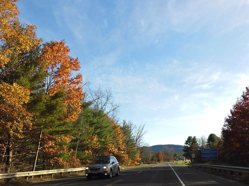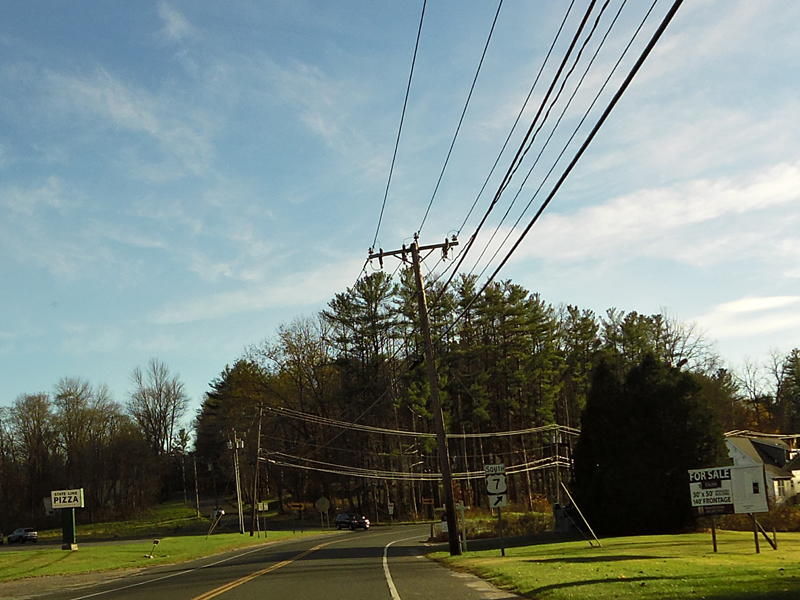 Welcome to Connecticut! Ashley Falls Road (SR 832) comes in from the right at an intersection with no route signage in this direction, and US 7 takes over its name.