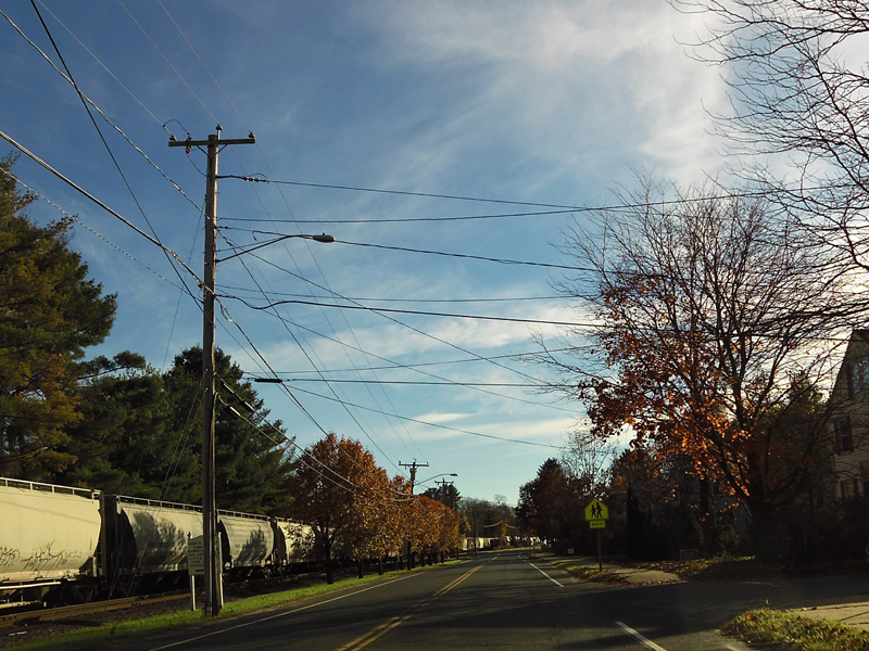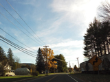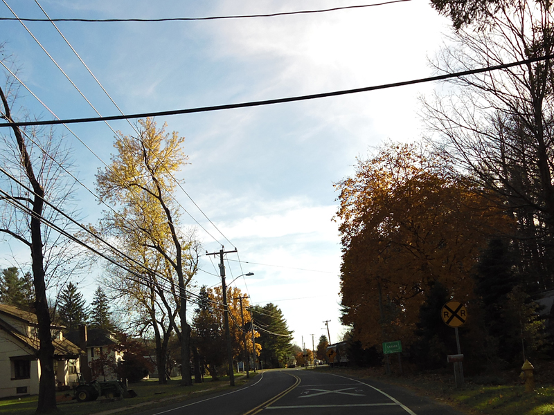 Welcome to Canaan! There is a railroad crossing, and Ashley Falls Road changes names to become Railroad Street.